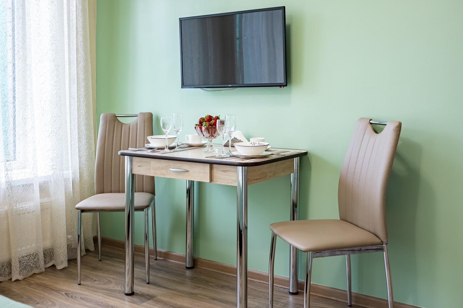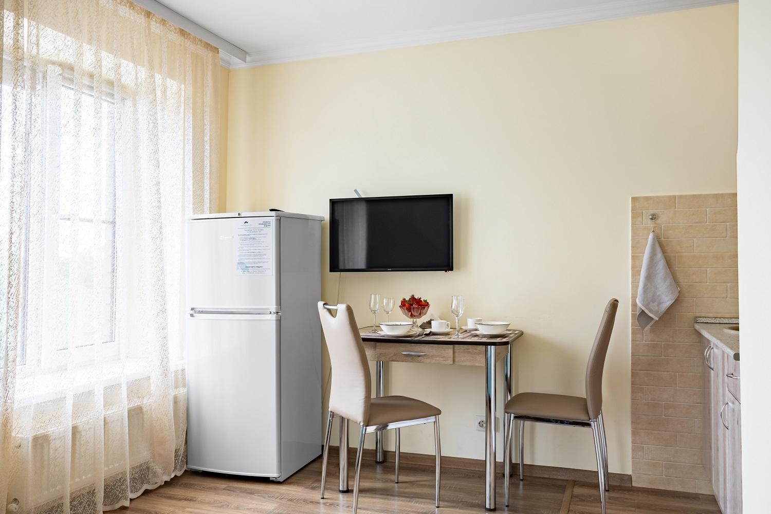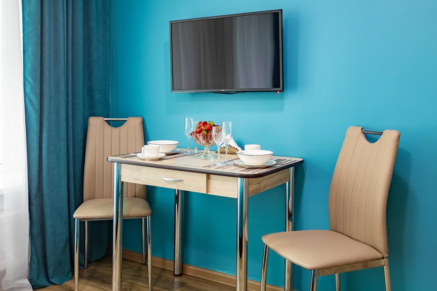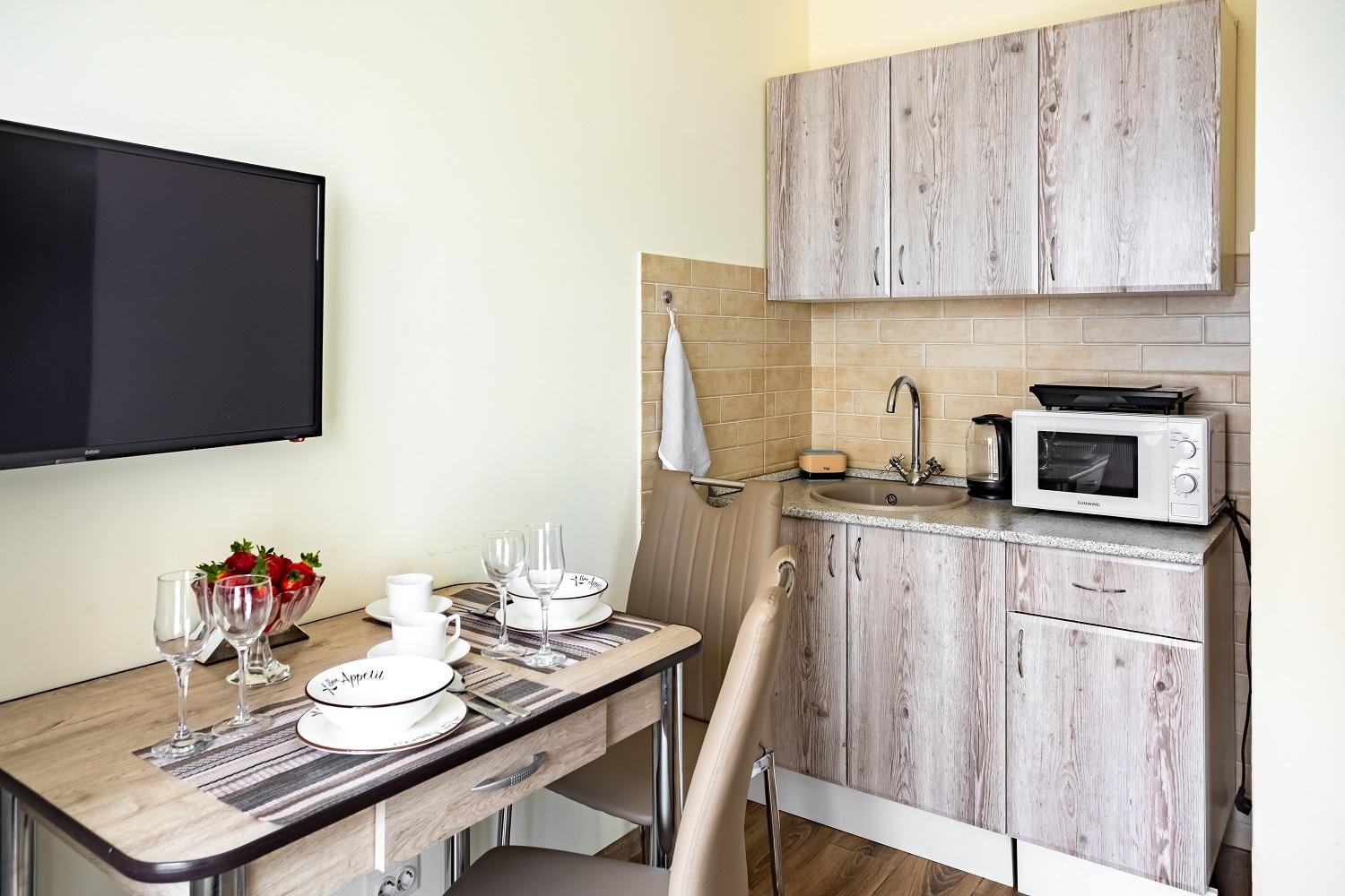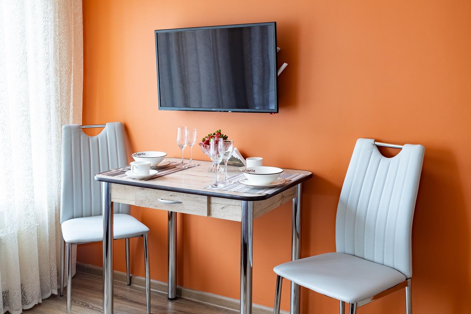 Апартаменты выполнены в индивидуальном дизайне. Мини-кухня, обеденная зона и бытовая техника сделают пребывание гостей комфортным и беззаботным.