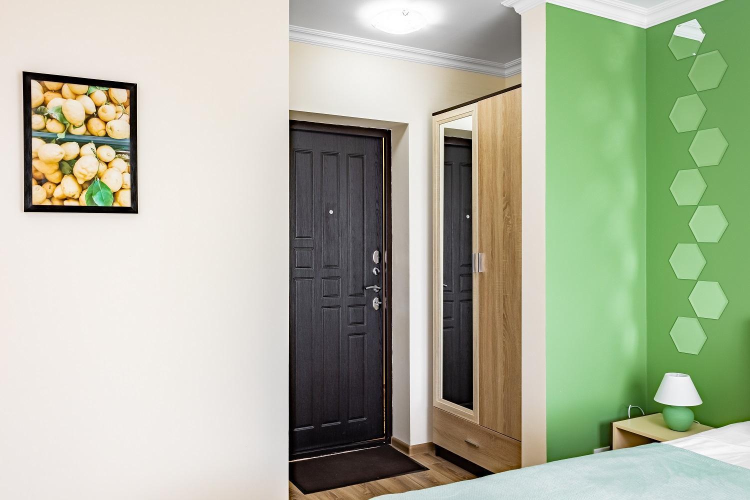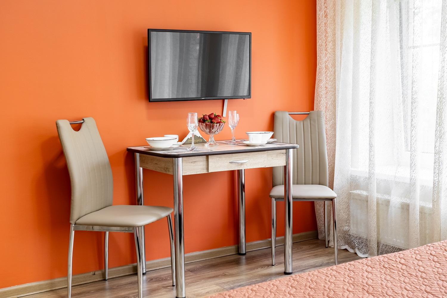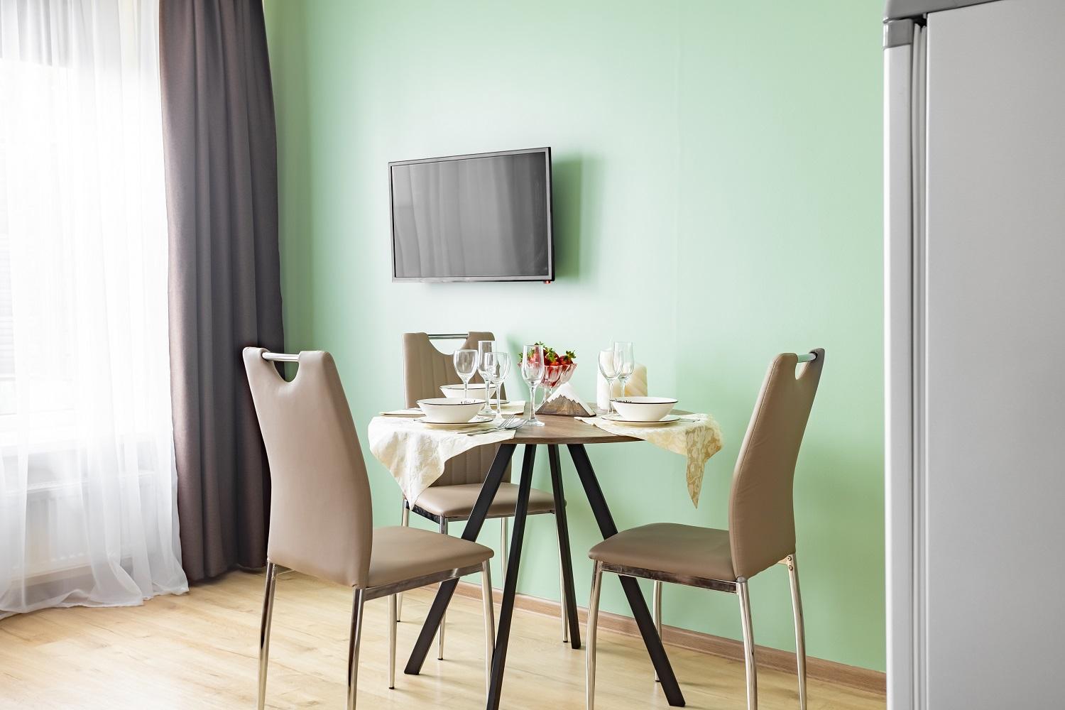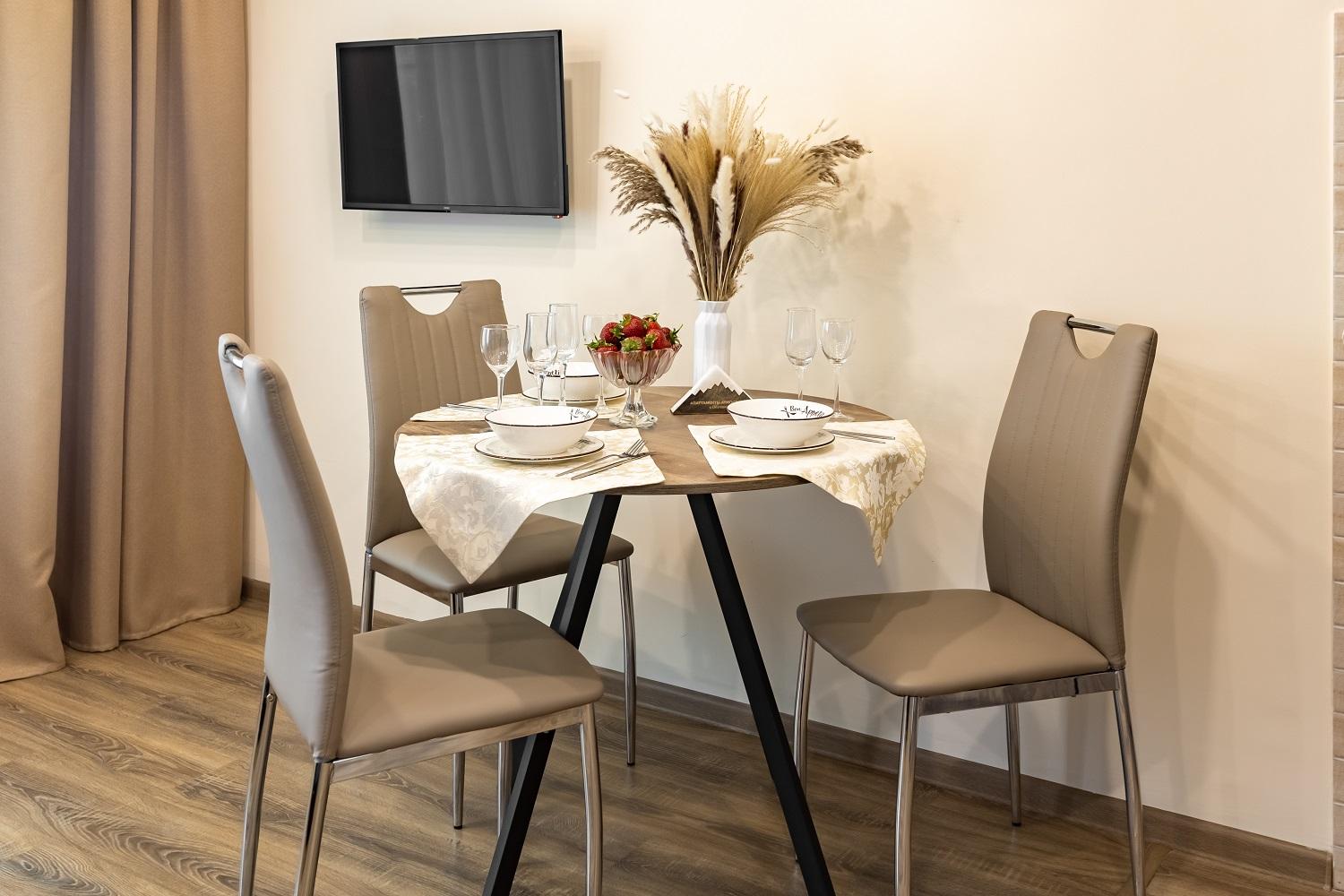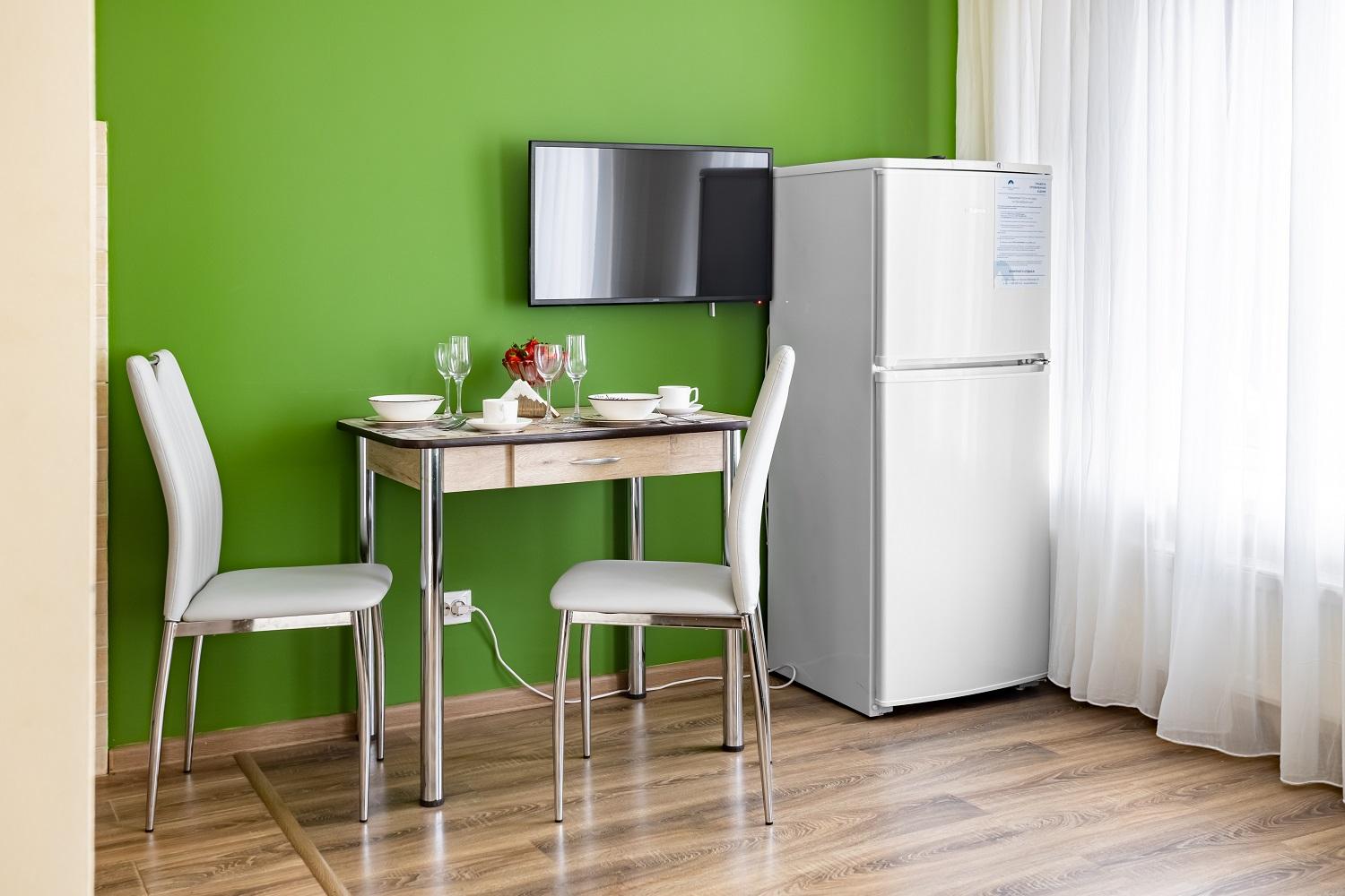 Апартаменты выполнены в индивидуальном дизайне. Мини-кухня, обеденная зона и бытовая техника сделают пребывание гостей комфортным и беззаботным.
