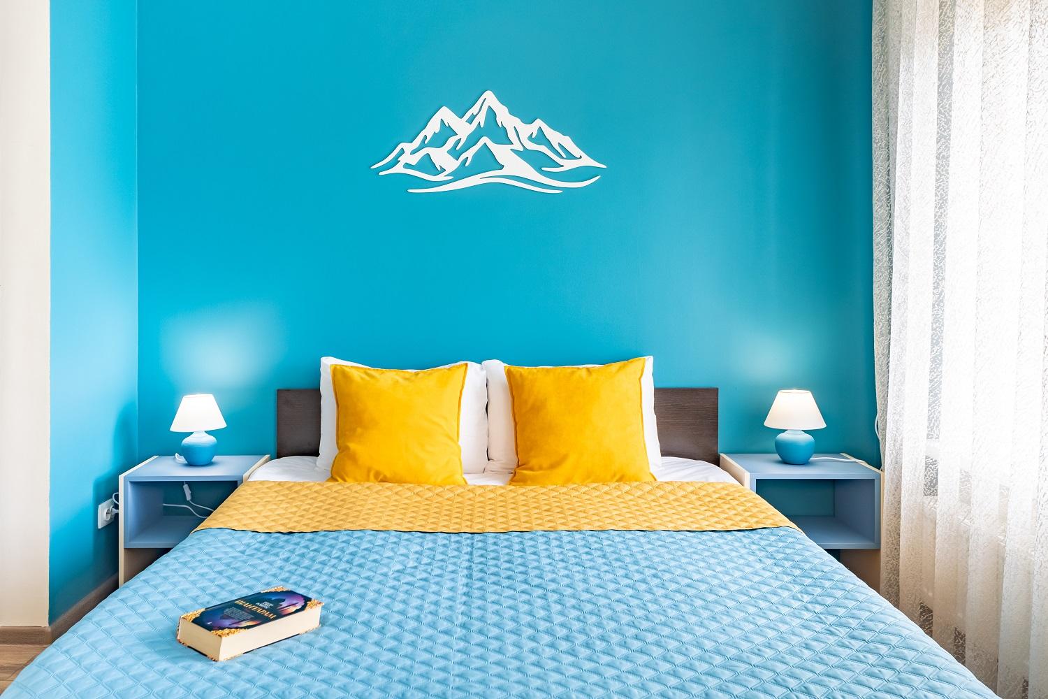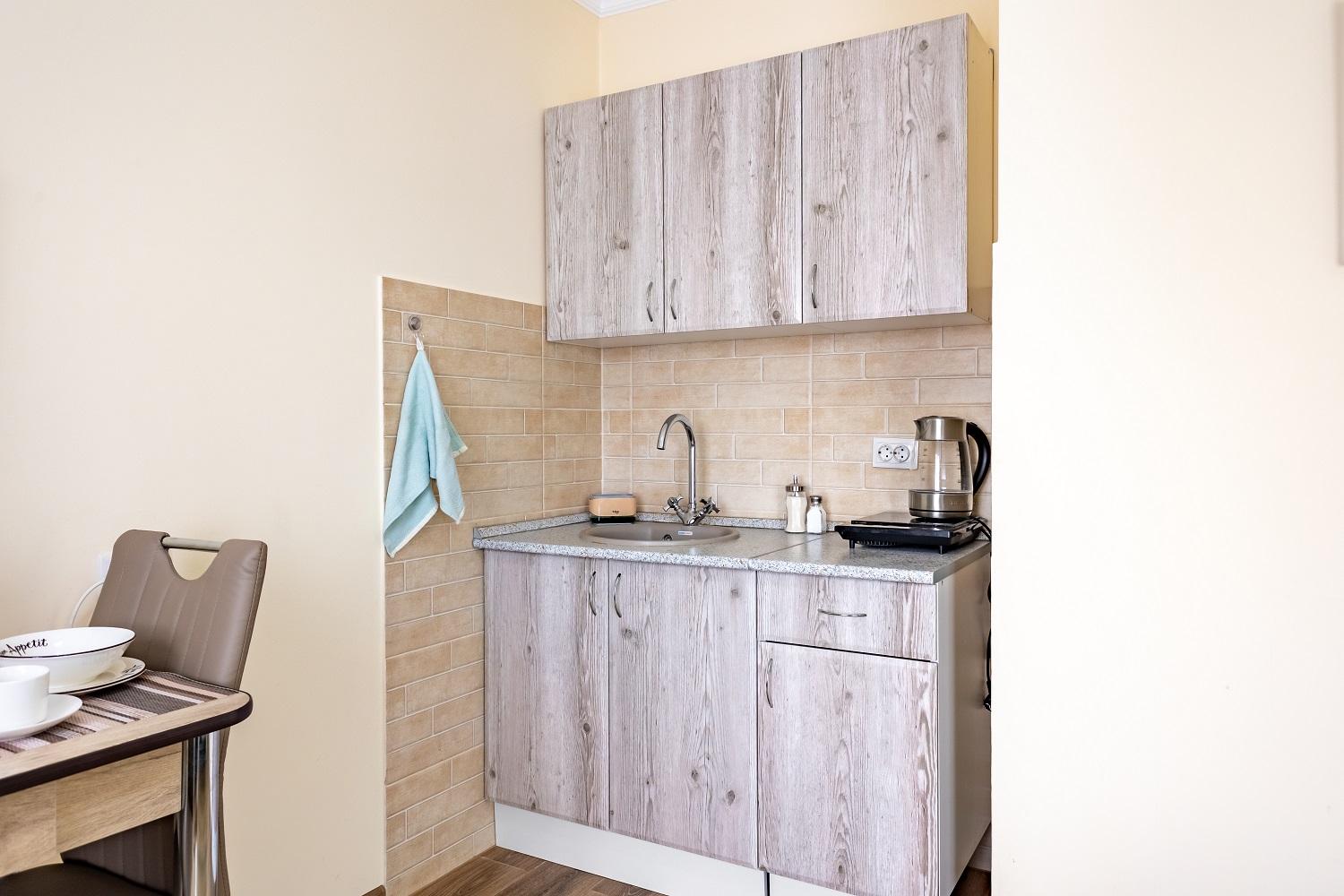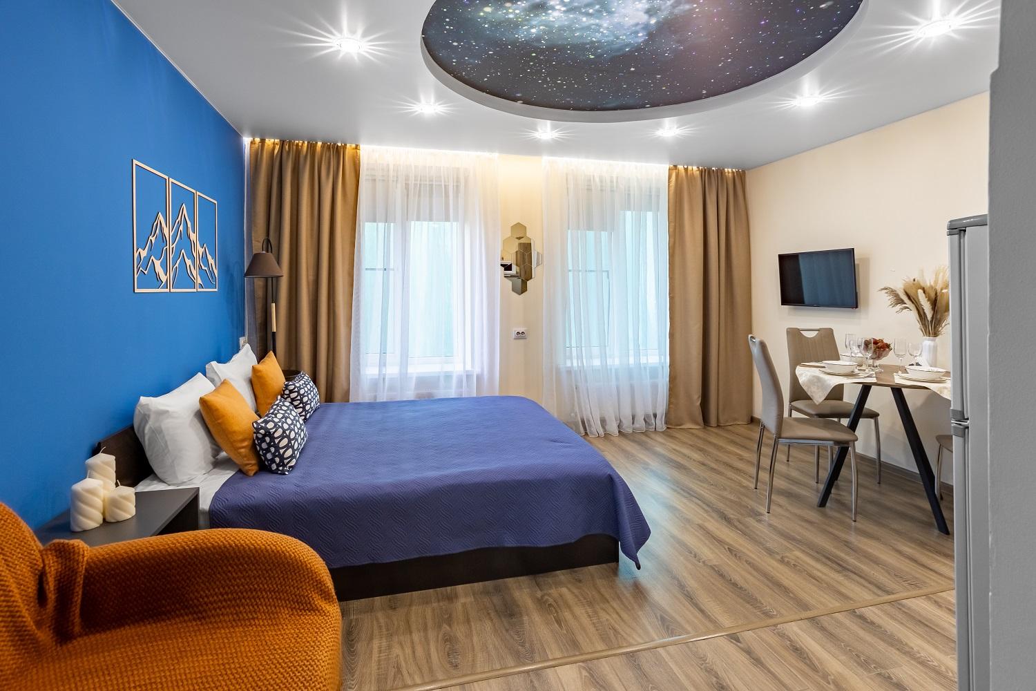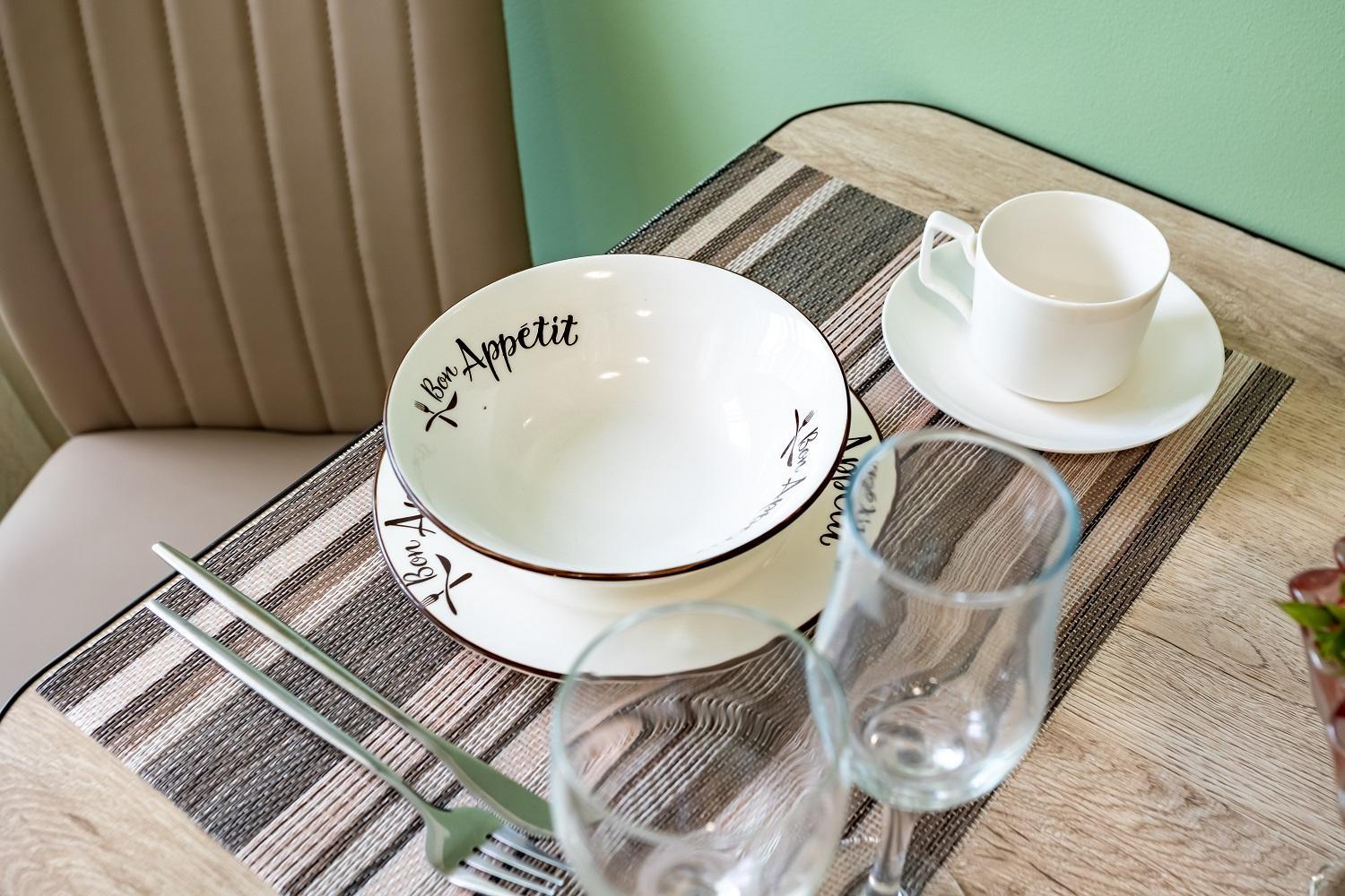 Апартаменты выполнены в индивидуальном дизайне. Мини-кухня, обеденная зона и бытовая техника сделают пребывание гостей комфортным и беззаботным.