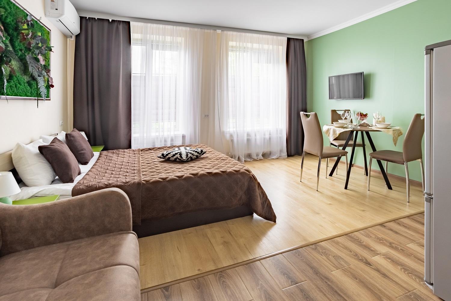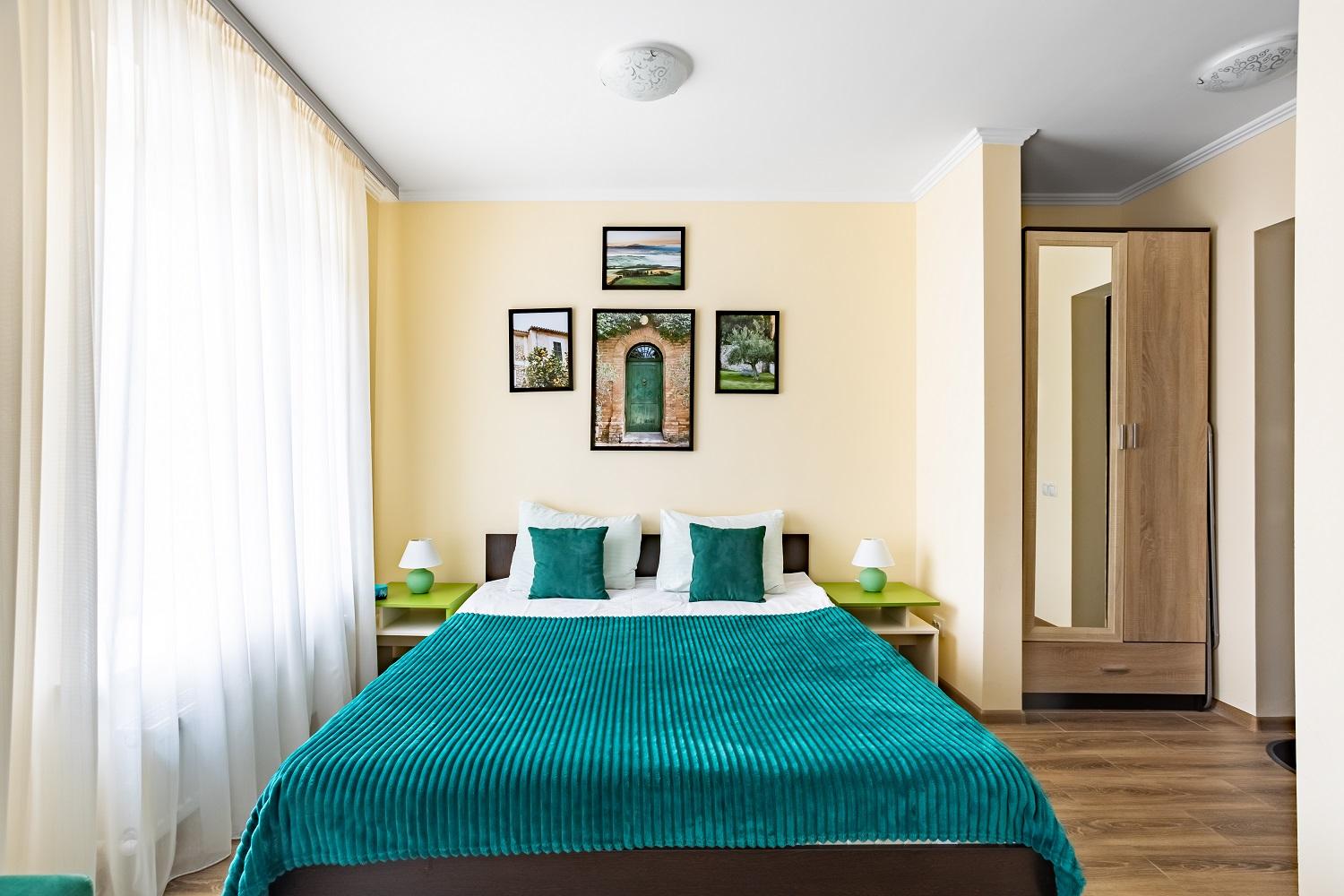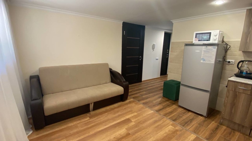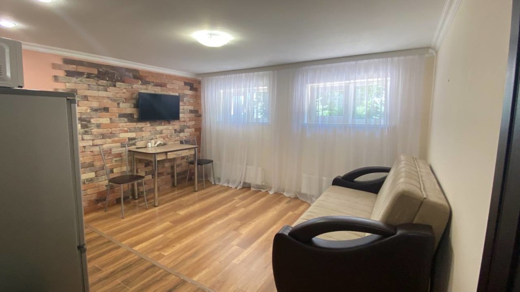 - В номере: душ, туалет, ТВ, холодильник, кондиционер, фен, мини-кухня, электрочайник, СВЧ-печь, двуспальная кровать, диван
