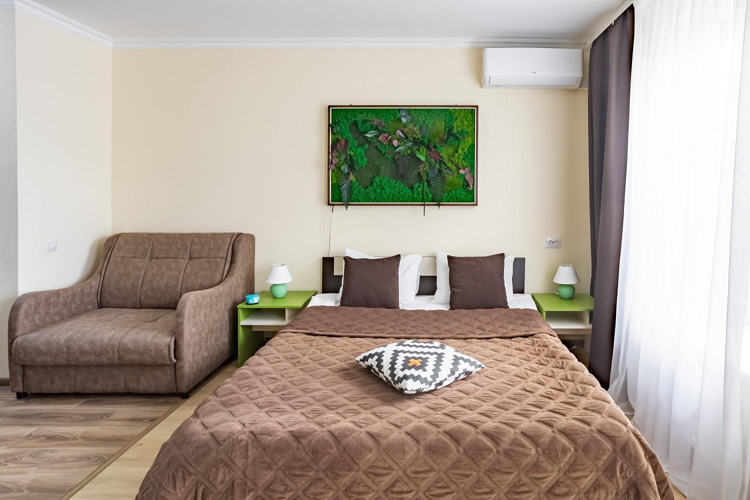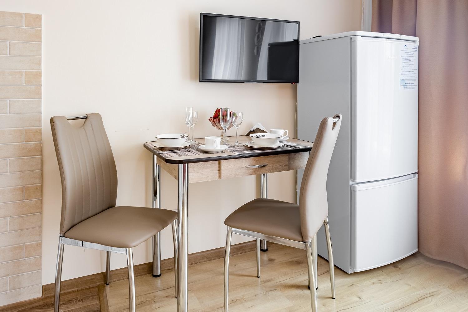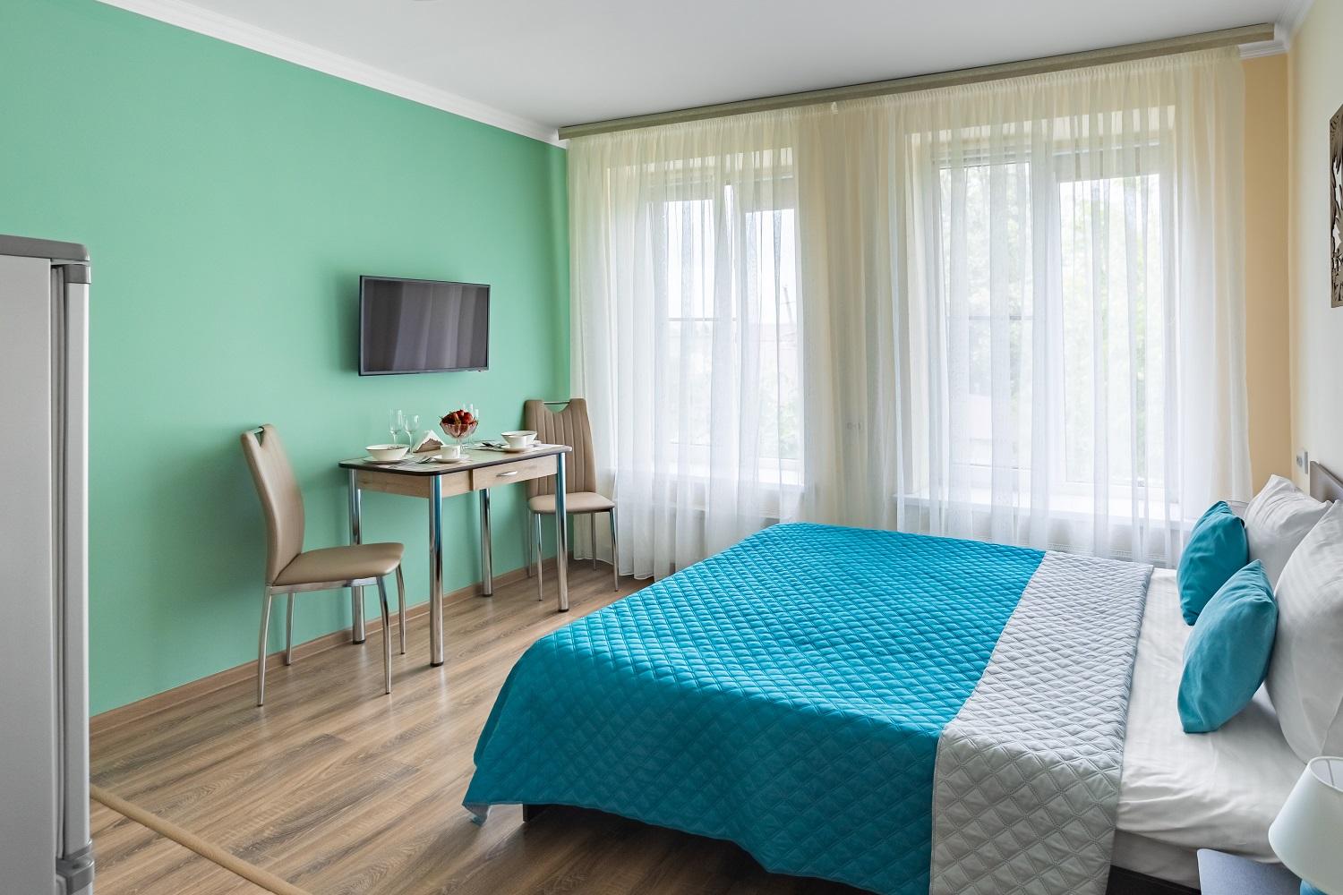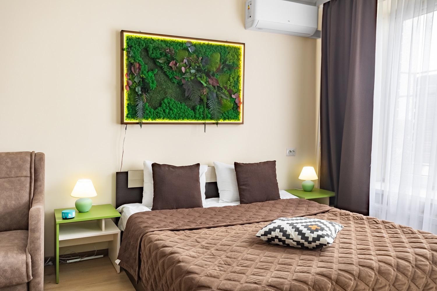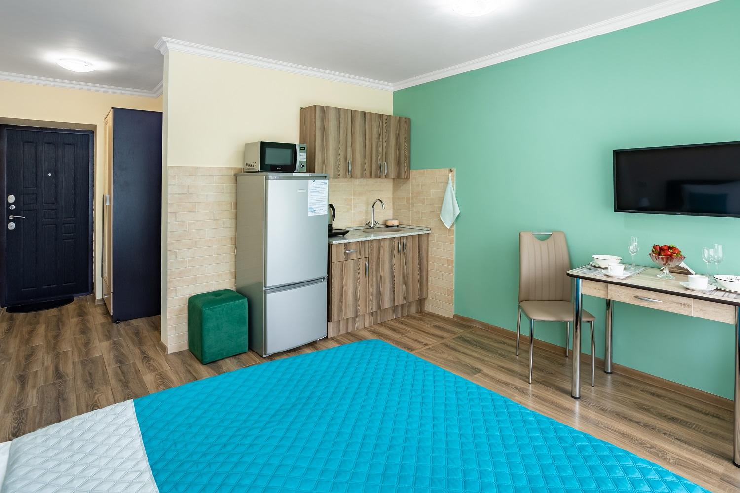 - В номере: душ, туалет, ТВ, холодильник, кондиционер, фен, мини-кухня, электрочайник, СВЧ-печь, двуспальная кровать, кресло