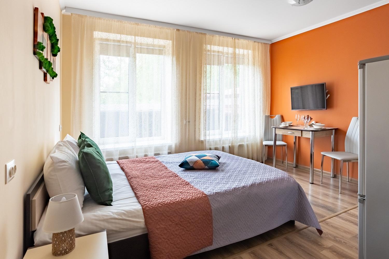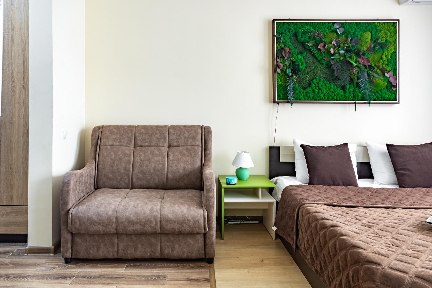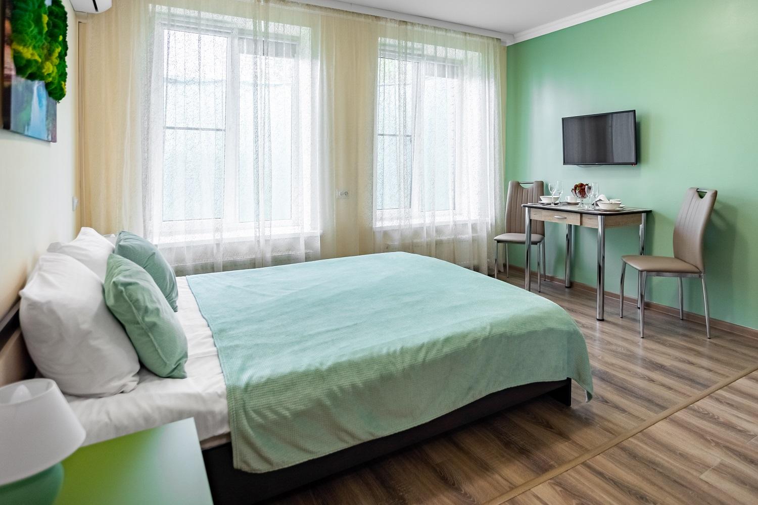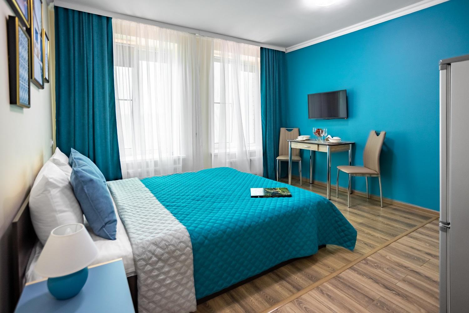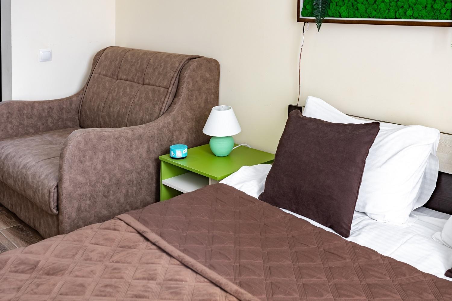 - В номере: душ, туалет, ТВ, холодильник, кондиционер, фен, мини-кухня, электрочайник, СВЧ-печь, двуспальная кровать, кресло
