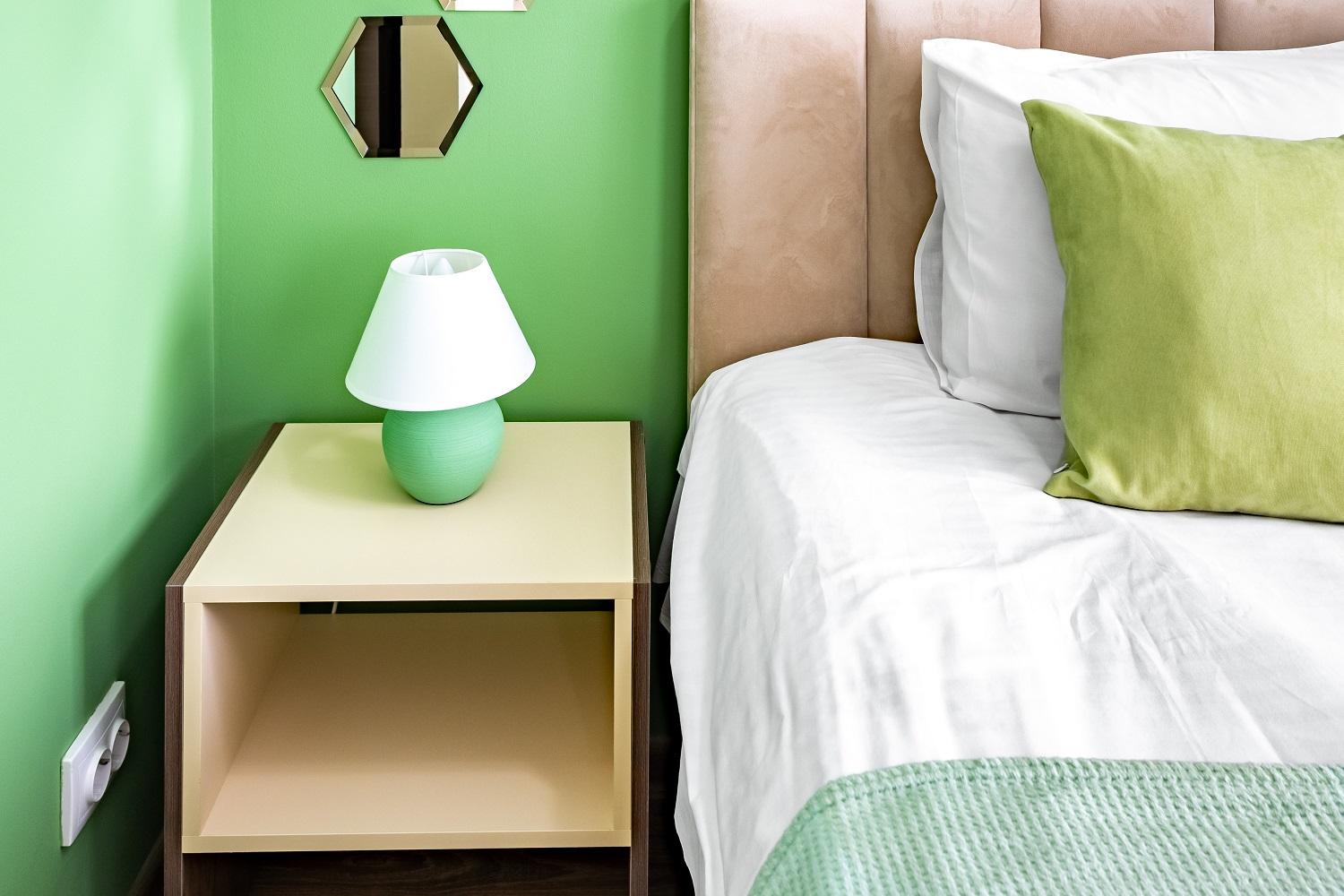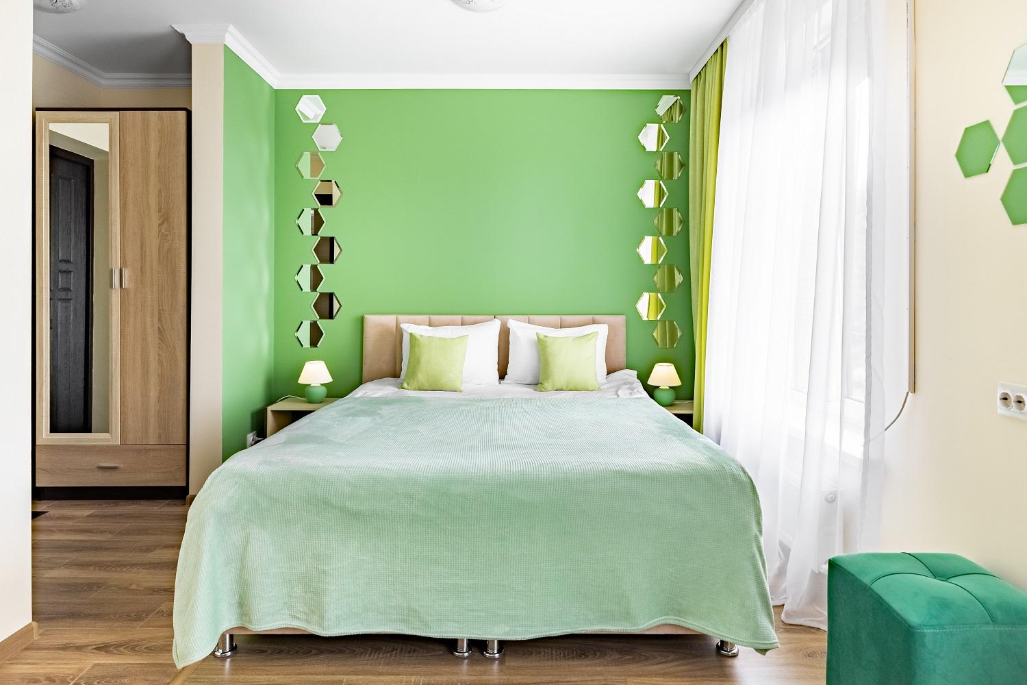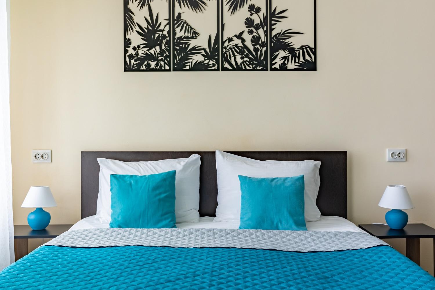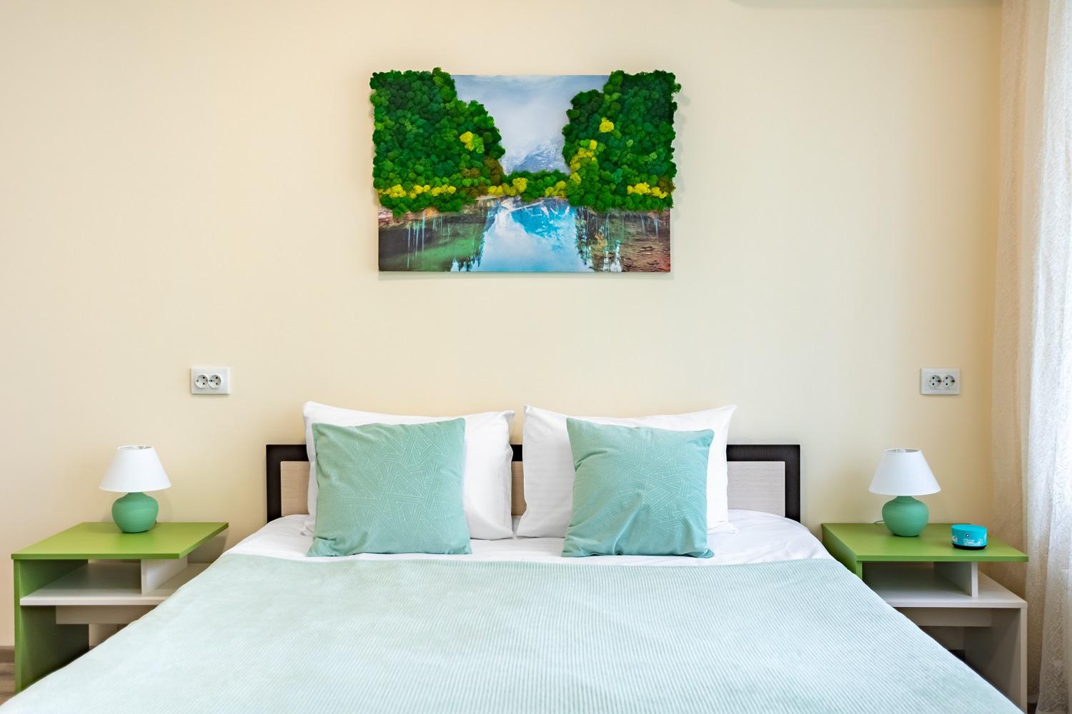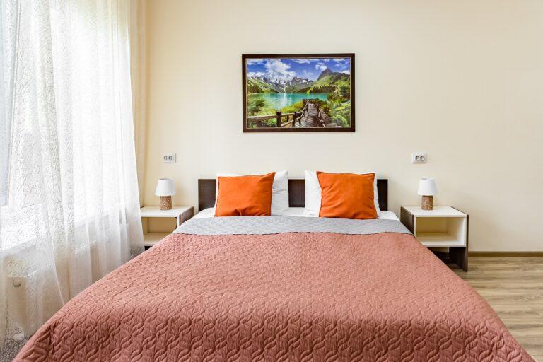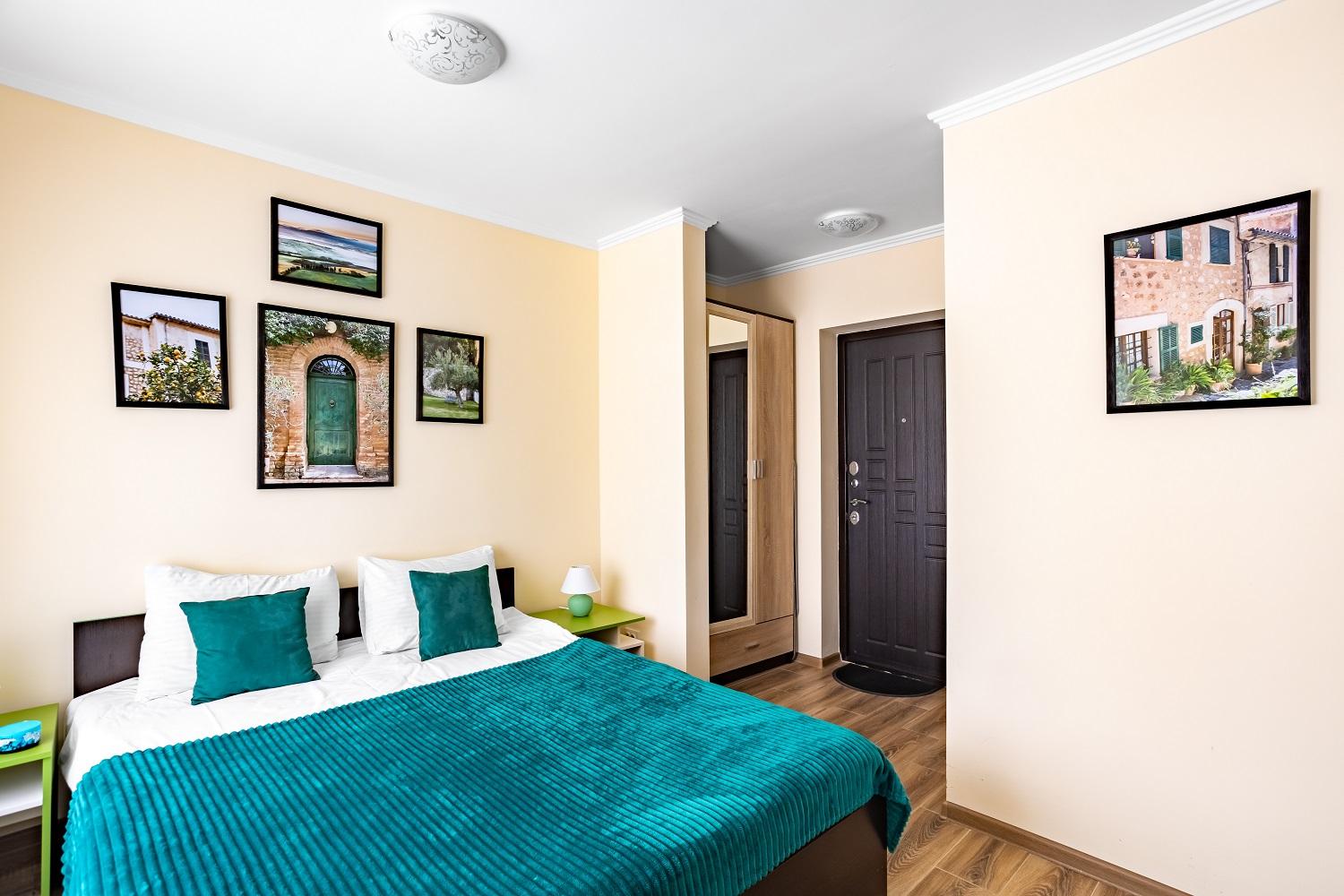 - В номере: душ, туалет, ТВ, холодильник, кондиционер, фен, мини-кухня, электрочайник, СВЧ-печь, двуспальная кровать, кресло