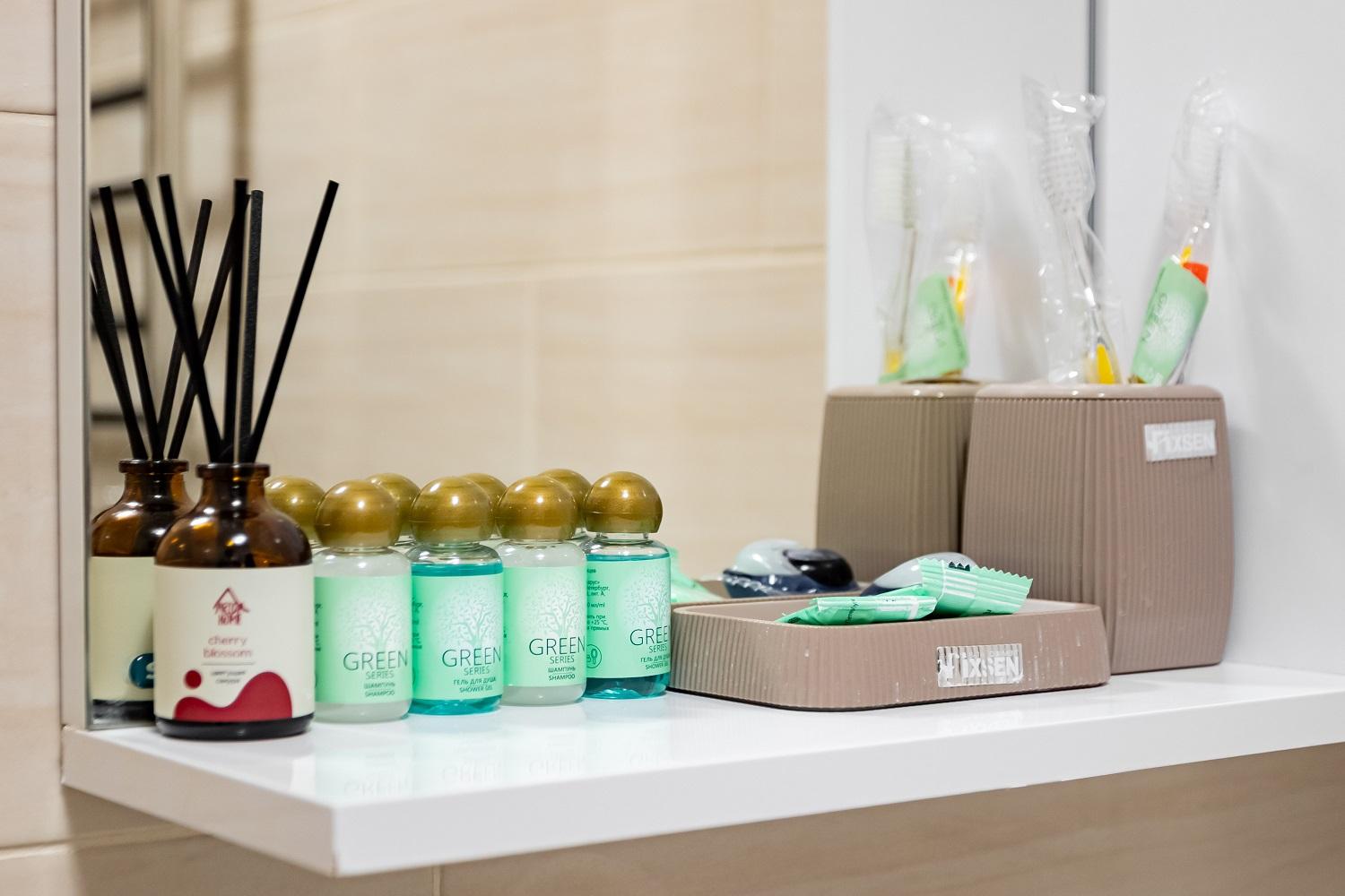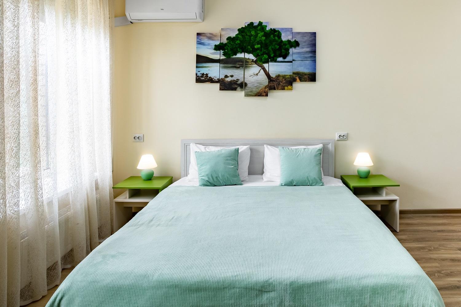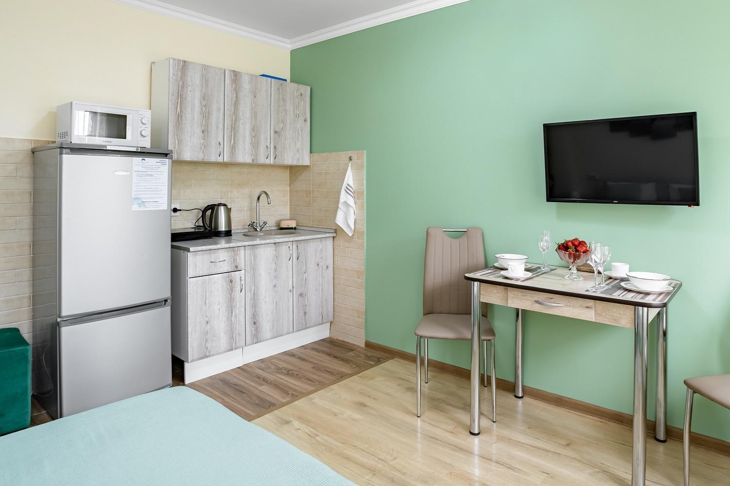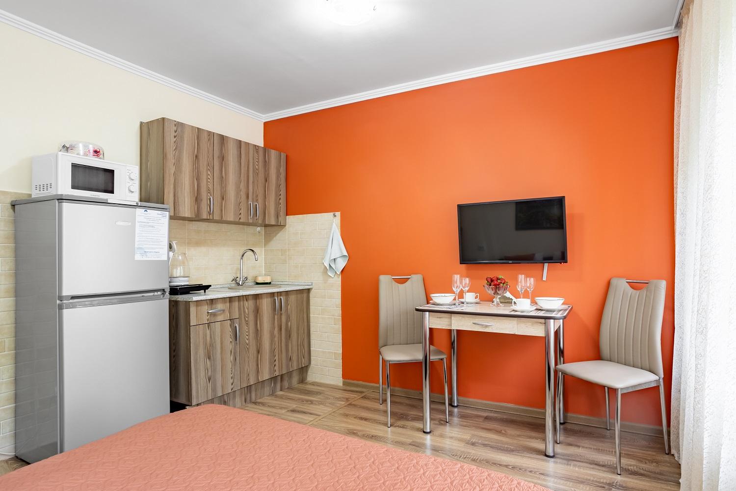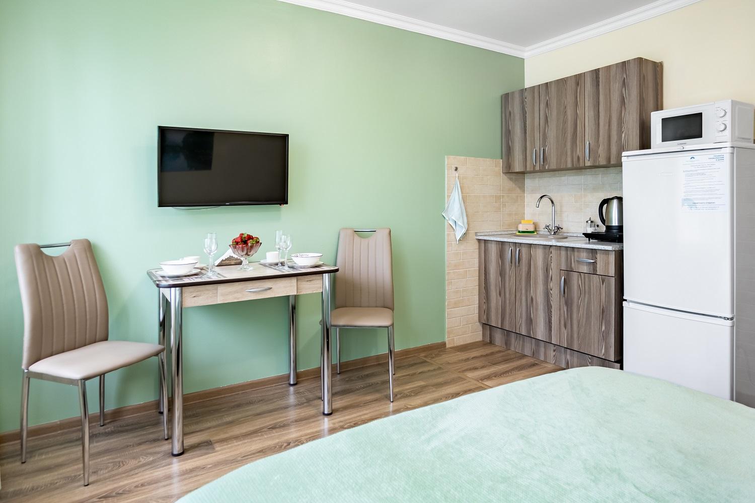- В номере: душ, туалет, ТВ, холодильник, кондиционер, мини-кухня, электрочайник, СВЧ-печь, двуспальная кровать