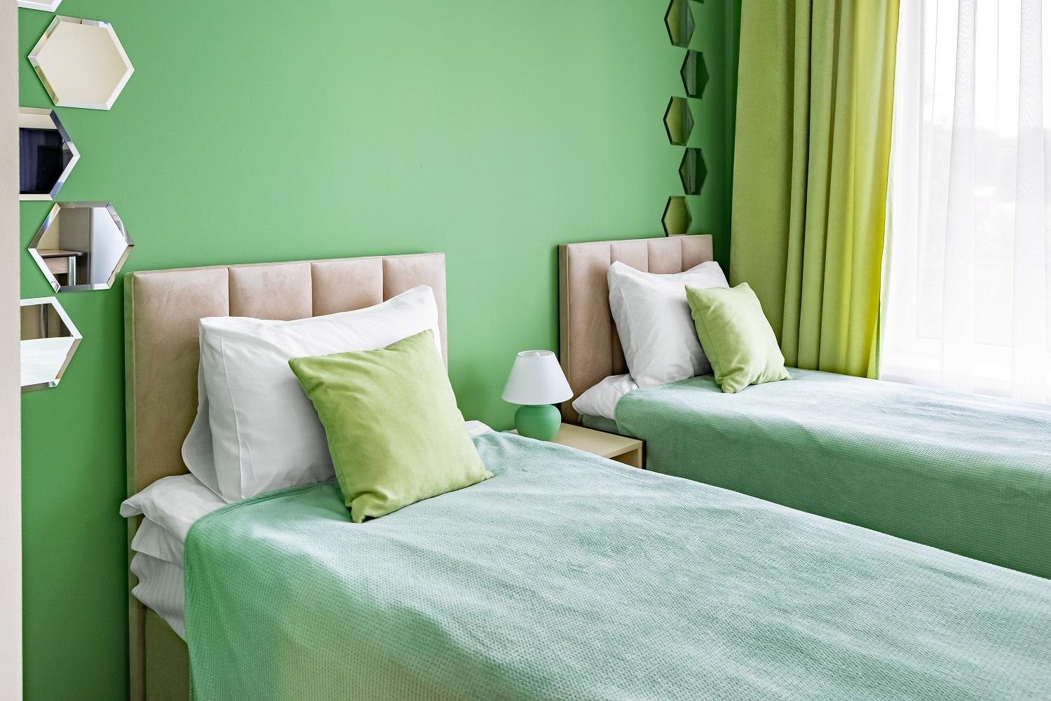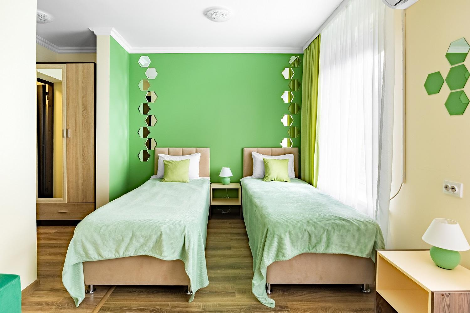 - В номере: душ, туалет, ТВ, холодильник, кондиционер, сейф, фен, электрочайник, СВЧ-печь, двуспальная или две раздельные кровати