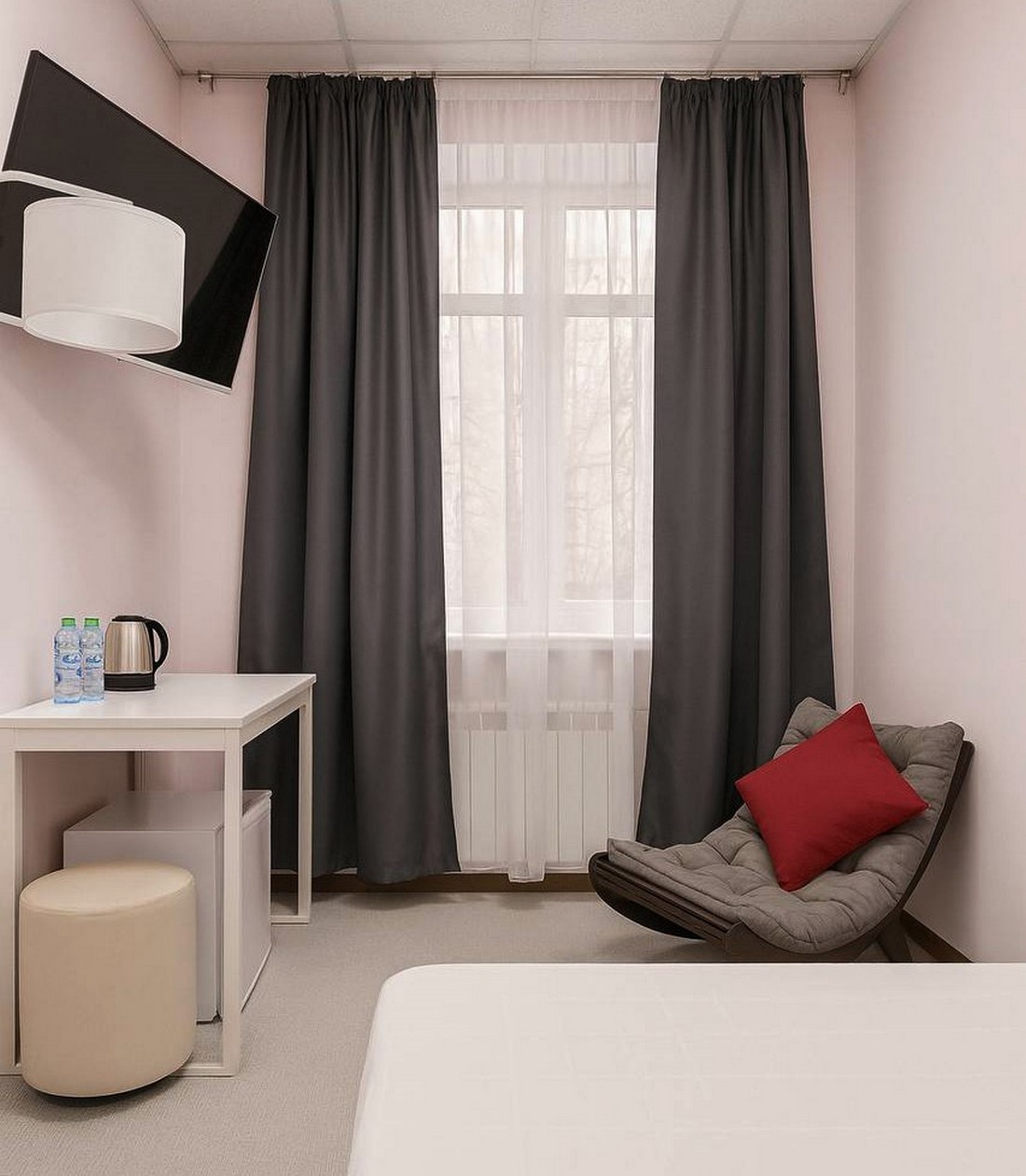 - В номере: душ, туалет, ТВ, холодильник, фен, электрочайник, односпальная кровать, кресло
