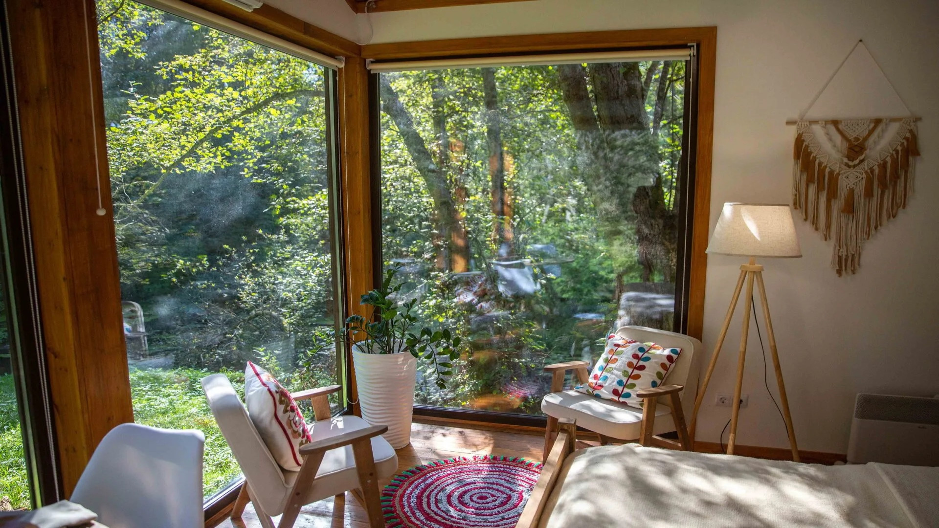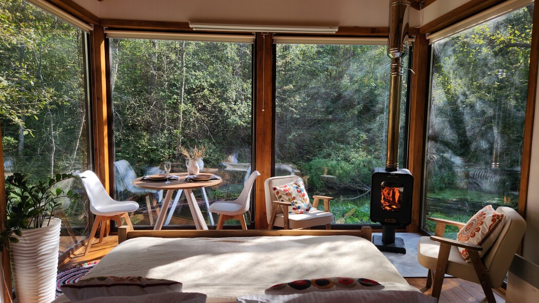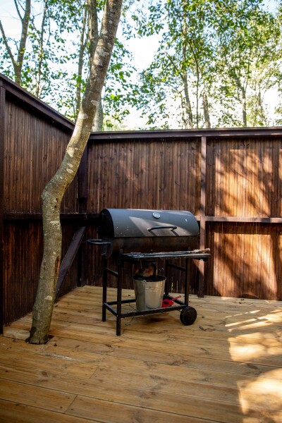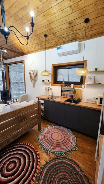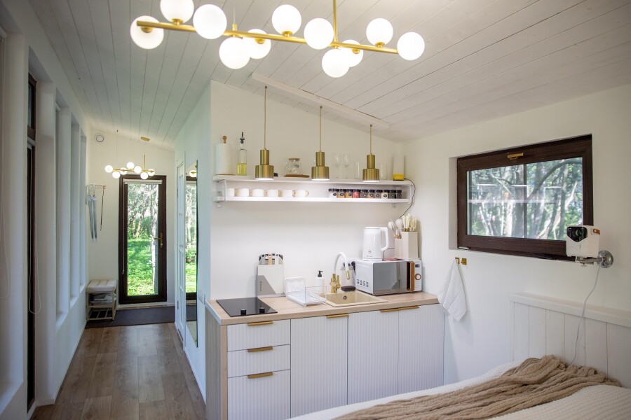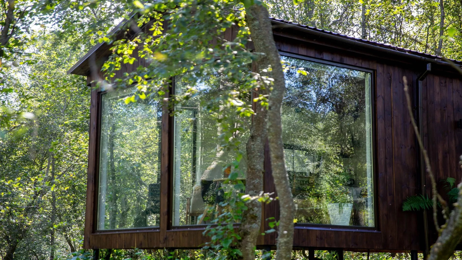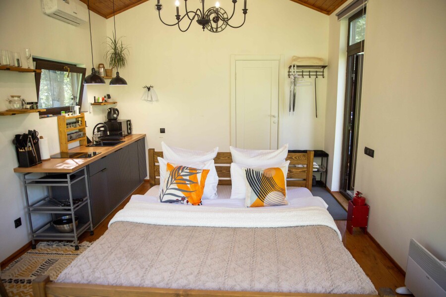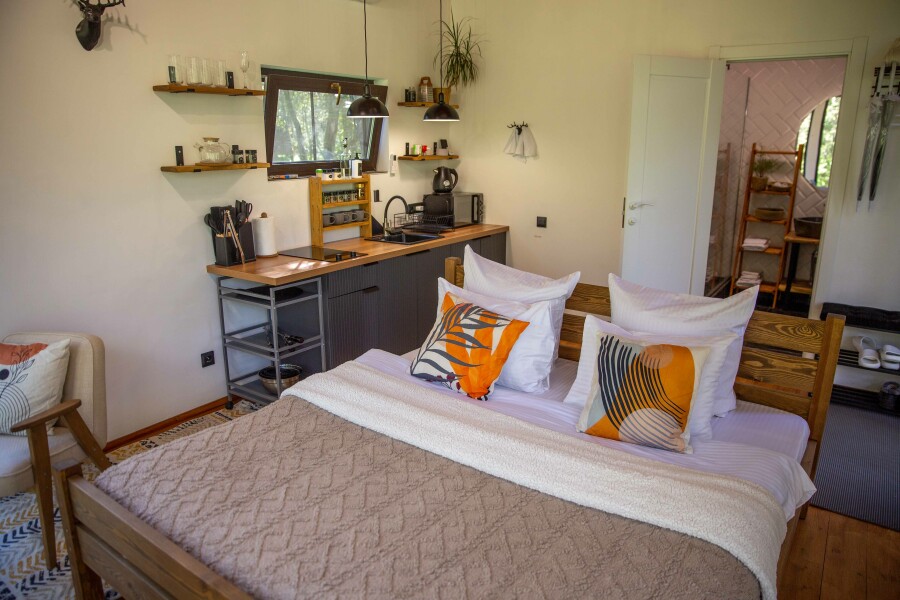 Глэмпинг находится в ольховом лесу, территория полностью лесная, концепция "без машин", гость оставляет автомобиль на парковке и пешком идет в домик.