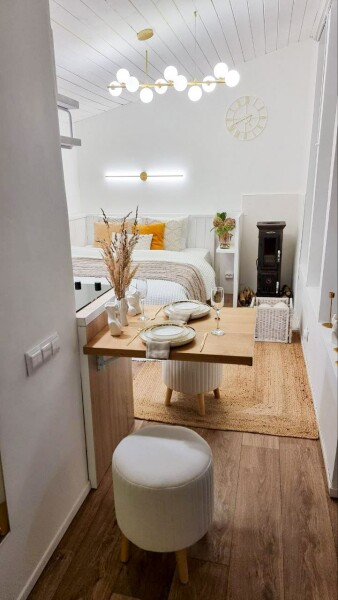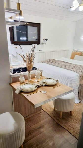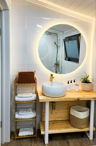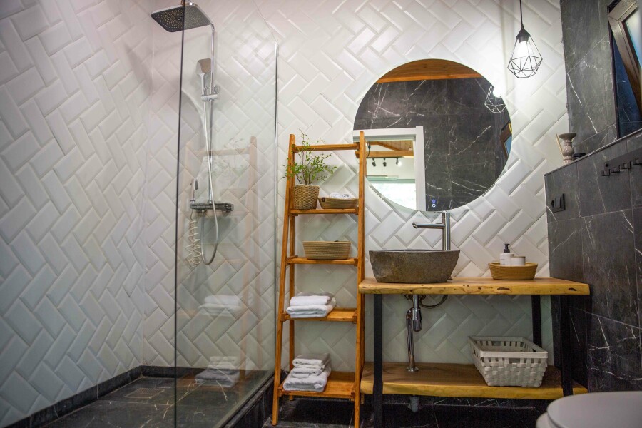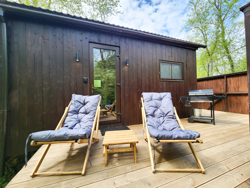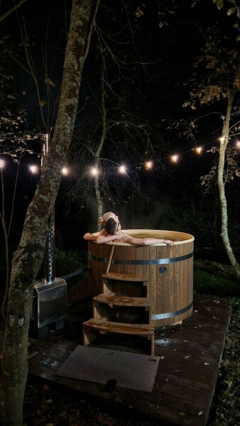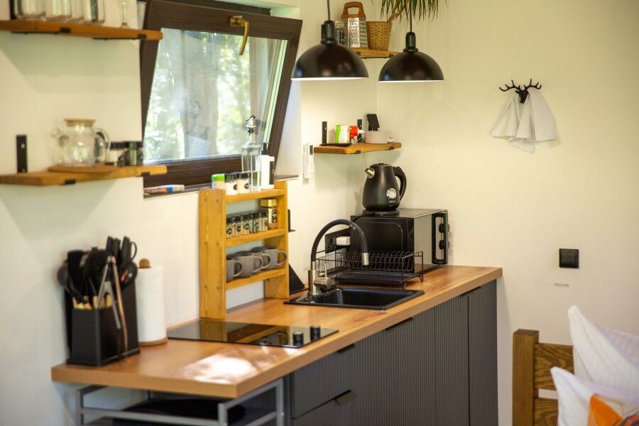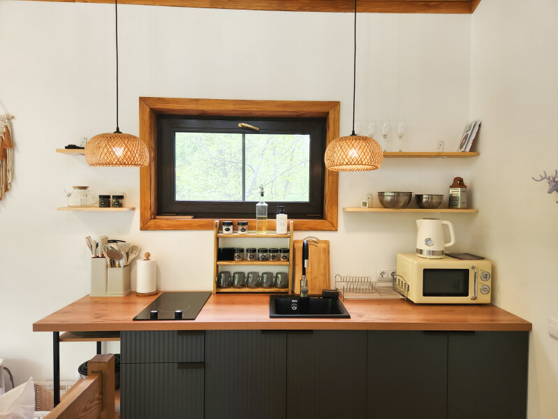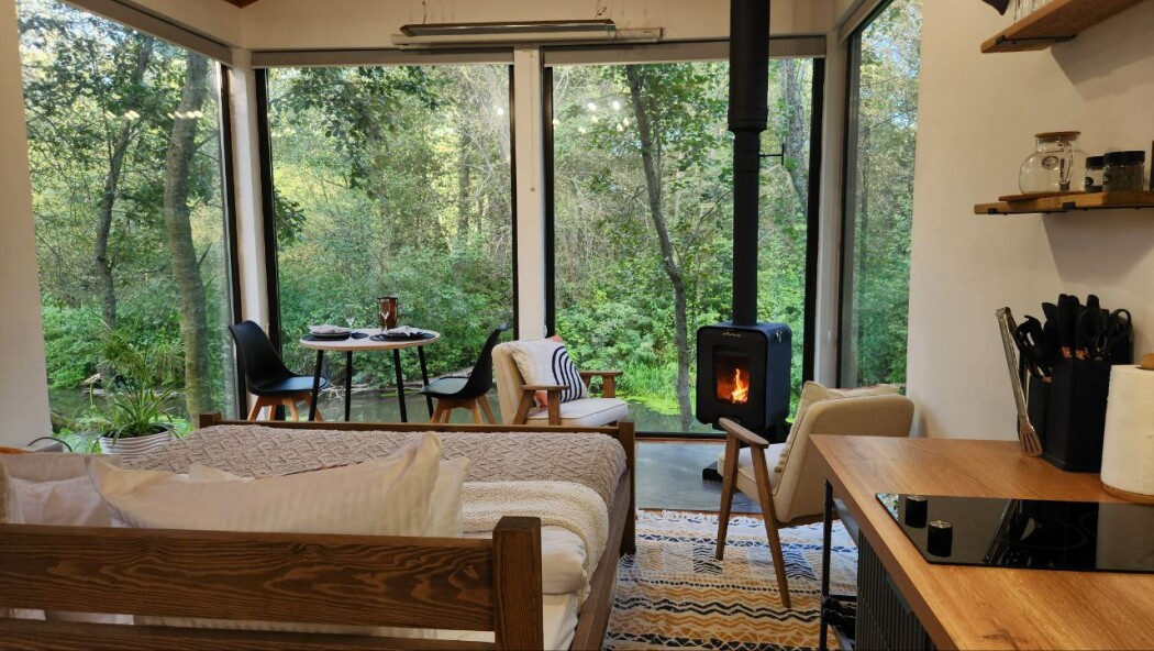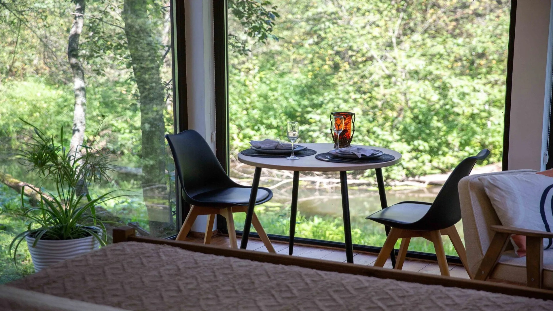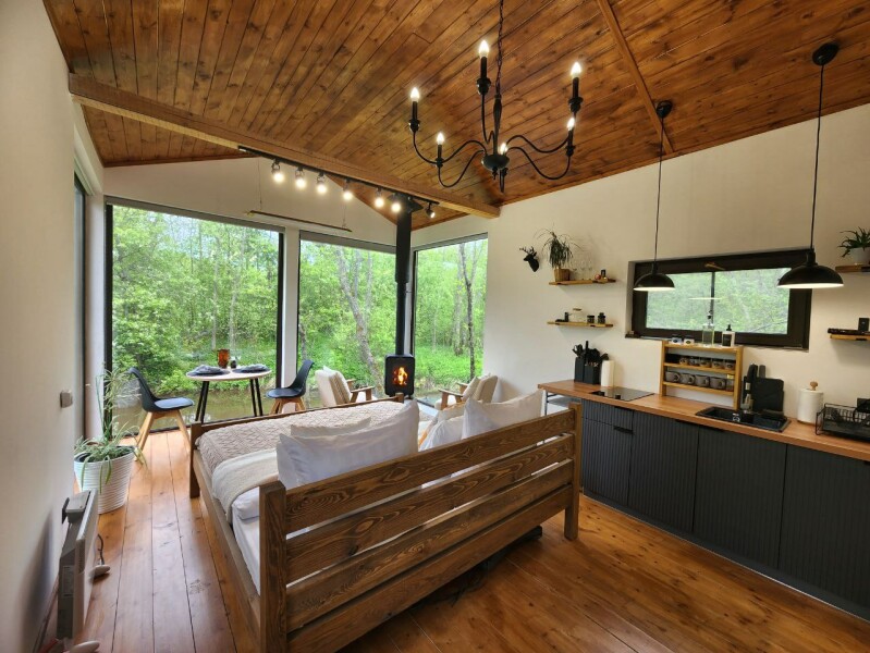 Глэмпинг находится в ольховом лесу, территория полностью лесная, концепция "без машин", гость оставляет автомобиль на парковке и пешком идет в домик.