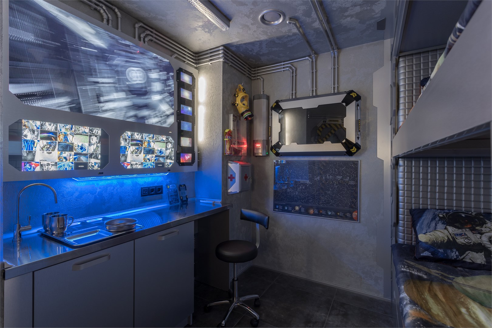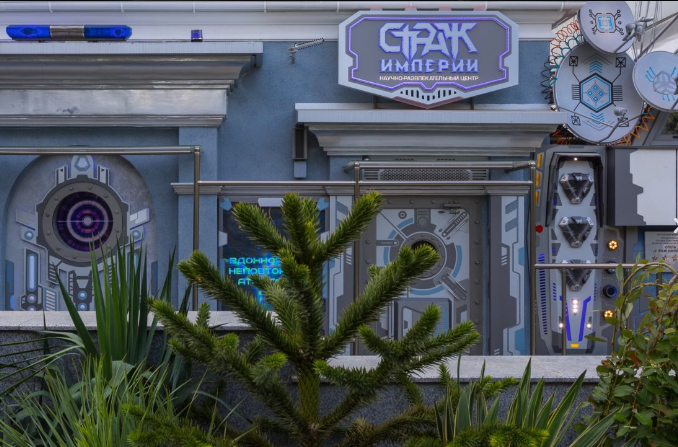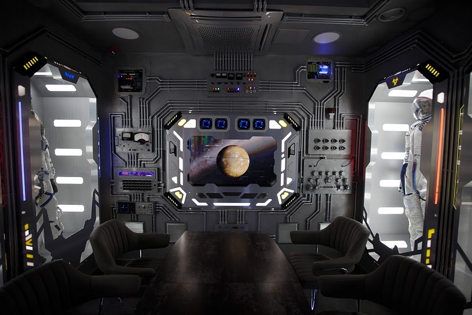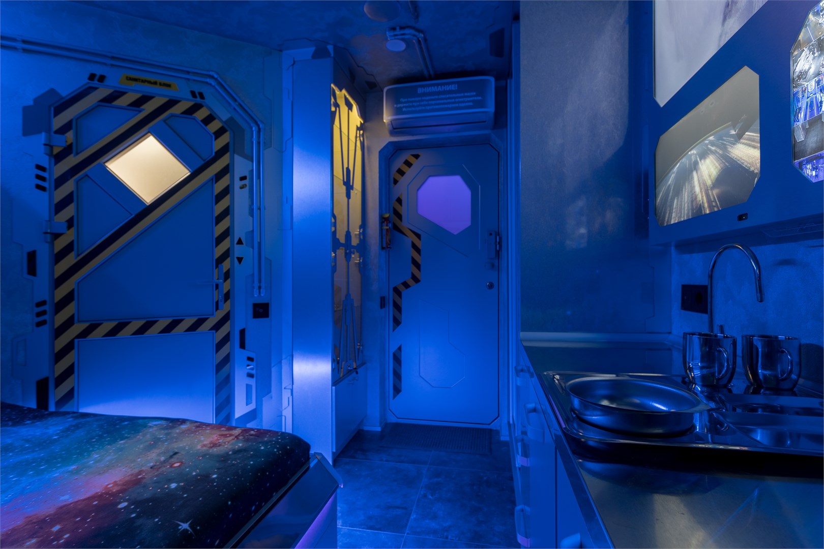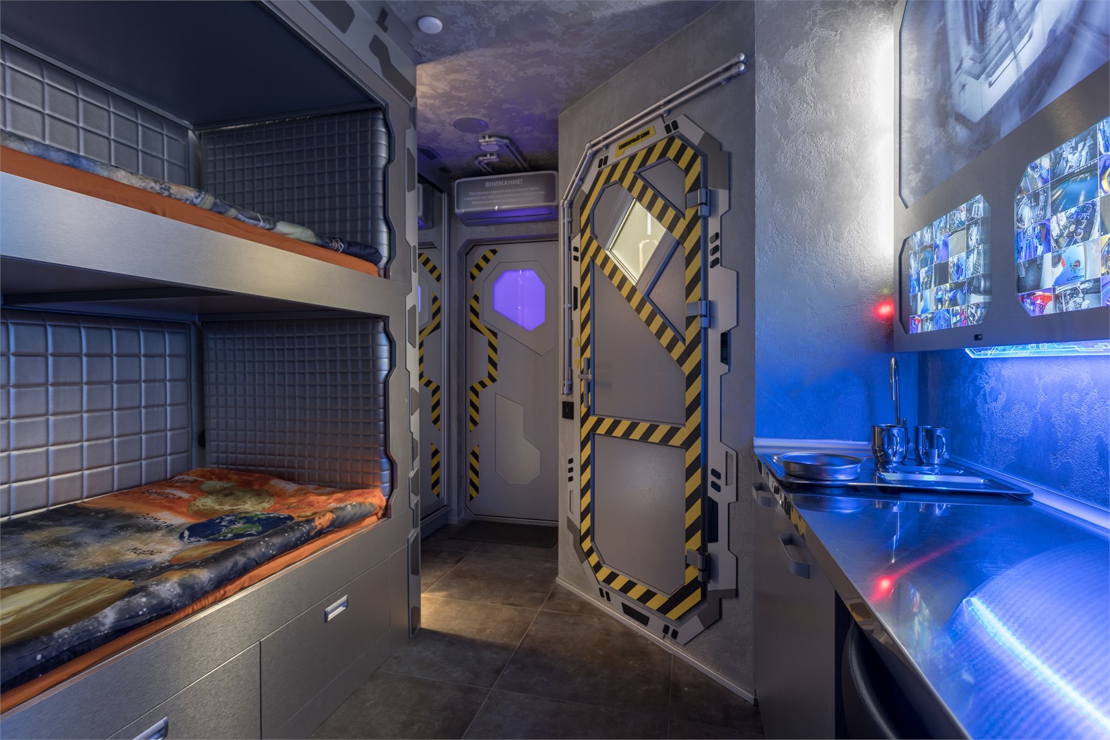 Космические каюты в гостинице "Страж Империи". Комплекс выполнен в виде фантастического космического корабля и включает в себя: 12 кают членов экипажа, готовых к проживанию. Ресепшн, рубка управления, кухня, кают-компания (столовая), сад Установлены три 3D симулятора, рубка управления. 3D симулятор от первого лица, платформа с подвесом. По всему кораблю находятся музейные экспонаты из фантастических фильмов, истории космонавтики, метеориты, образцы современной техники -проекторы, 3D телевизоры, гобопроекторы, интерактивные столы, компьютеры и т.д. В комплексе использовано 350 телевизоров и 120 планшетов. На комплексе воссоздана обстановка космического корабля во всех деталях любого космического блокбастера. Идут постоянные сообщения, потоки видео, в иллюминаторах космос, планеты и полет, и т.д. Обстановка приближена к настоящей. Назначение комплекса: - проведение экскурсий по кораблю на 40 минут - проживание в каютах реального космического корабля, погружение в полную космическую обстановку. Комфортабельные и уютные каюты для полноценного погружения в атмосферу космических приключений. На Ваш выбор двух- и трёхместные каюты, в каждой из которых собственная душевая и туалет, удобные кровати, стол, интерактивные мониторы и небольшая библиотека отечественной и зарубежной фантастики. Окна в каютах отсутствуют. Этим Вы более глубокого погрузитесь в атмосферу заведения.