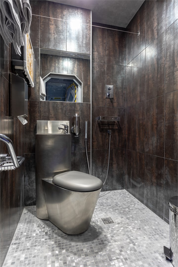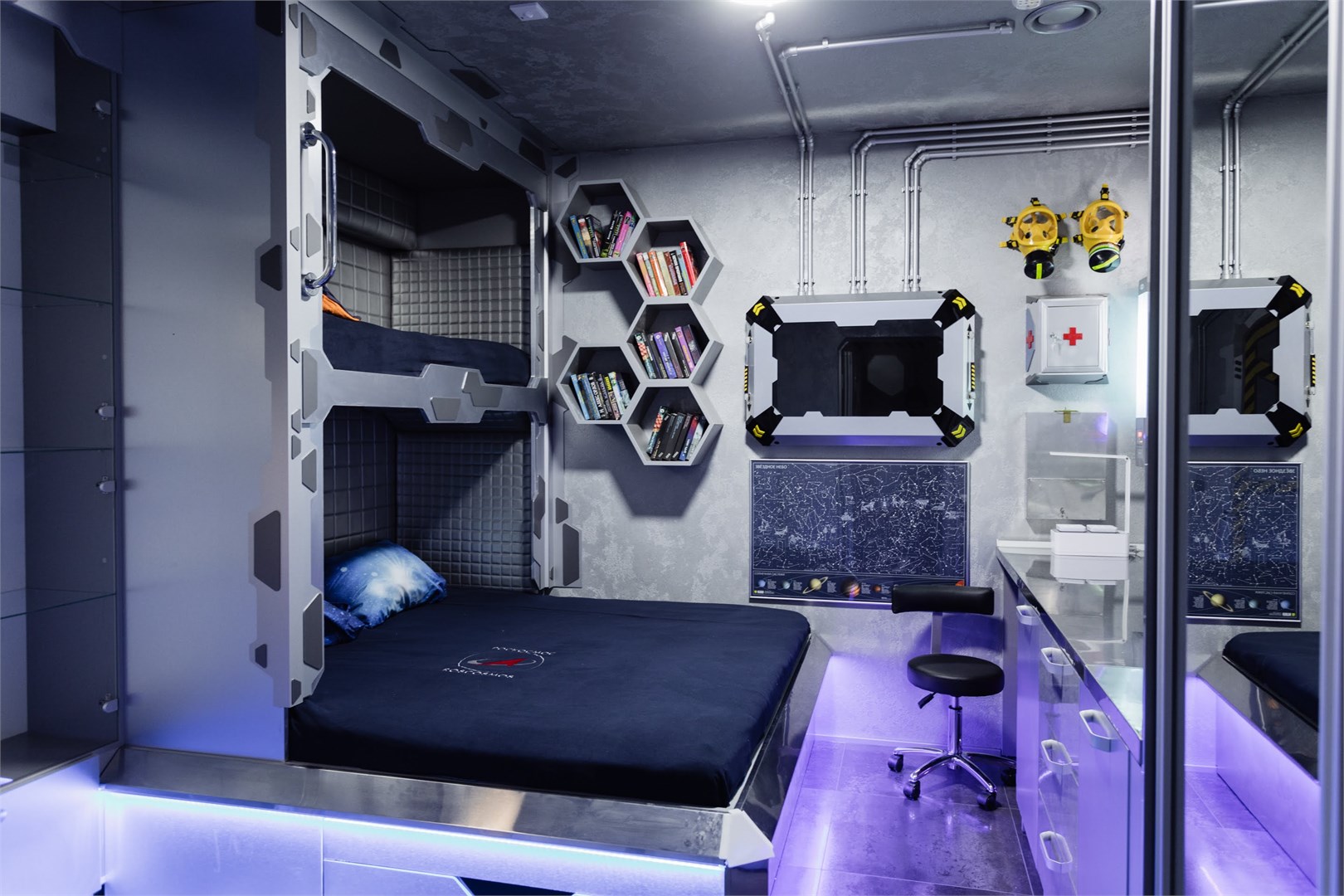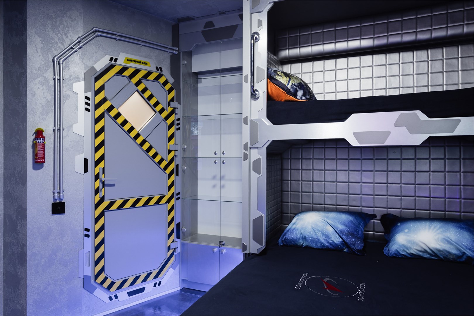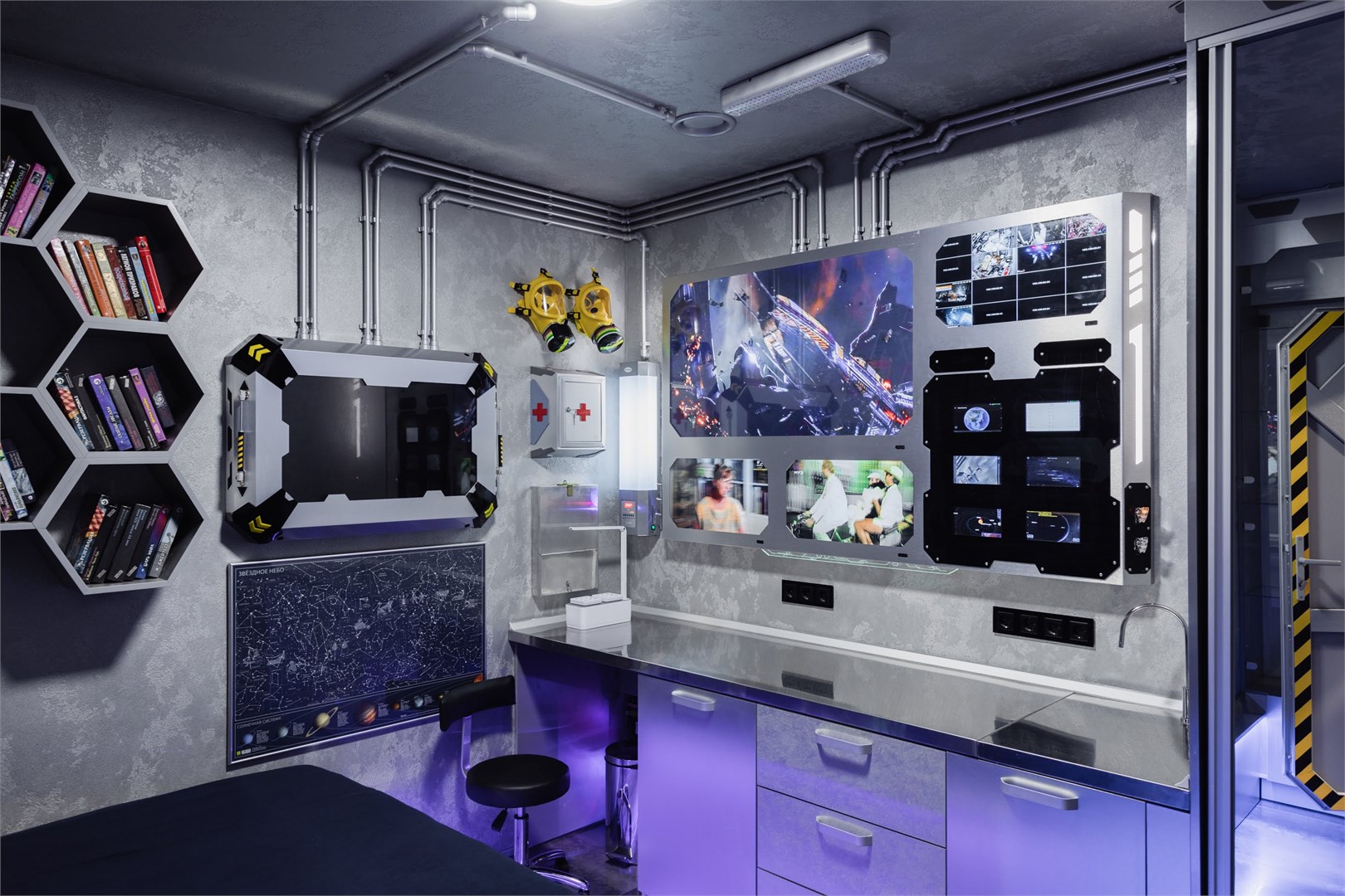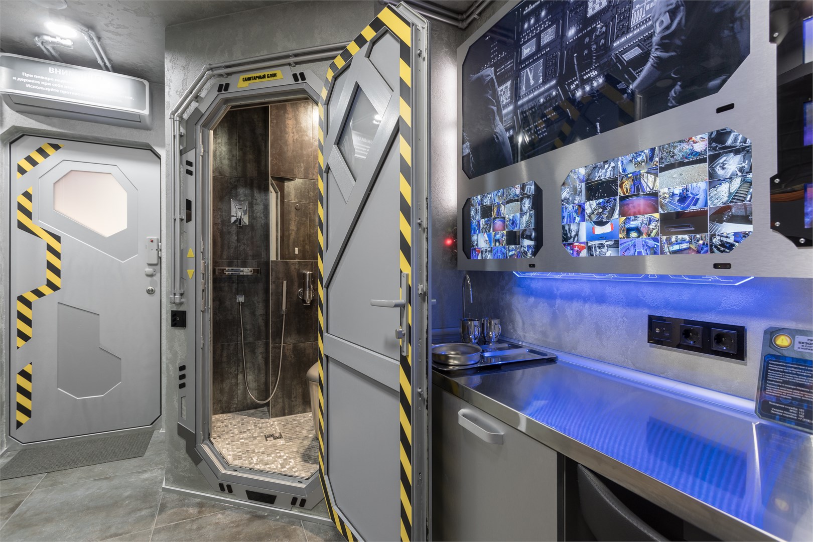 Космические каюты в гостинице "Страж Империи". Комплекс выполнен в виде фантастического космического корабля и включает в себя: 12 кают членов экипажа, готовых к проживанию. Ресепшн, рубка управления, кухня, кают-компания (столовая), сад Установлены три 3D симулятора, рубка управления. 3D симулятор от первого лица, платформа с подвесом. По всему кораблю находятся музейные экспонаты из фантастических фильмов, истории космонавтики, метеориты, образцы современной техники -проекторы, 3D телевизоры, гобопроекторы, интерактивные столы, компьютеры и т.д. В комплексе использовано 350 телевизоров и 120 планшетов. На комплексе воссоздана обстановка космического корабля во всех деталях любого космического блокбастера. Идут постоянные сообщения, потоки видео, в иллюминаторах космос, планеты и полет, и т.д. Обстановка приближена к настоящей. Назначение комплекса: - проведение экскурсий по кораблю на 40 минут - проживание в каютах реального космического корабля, погружение в полную космическую обстановку. Комфортабельные и уютные каюты для полноценного погружения в атмосферу космических приключений. На Ваш выбор двух- и трёхместные каюты, в каждой из которых собственная душевая и туалет, удобные кровати, стол, интерактивные мониторы и небольшая библиотека отечественной и зарубежной фантастики. Окна в каютах отсутствуют. Этим Вы более глубокого погрузитесь в атмосферу заведения.
