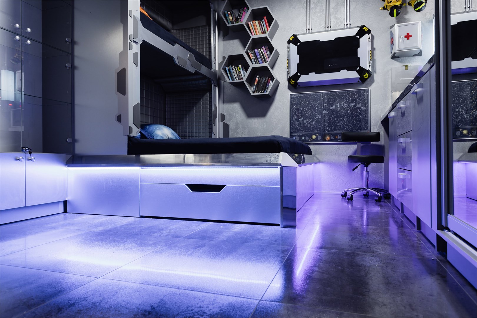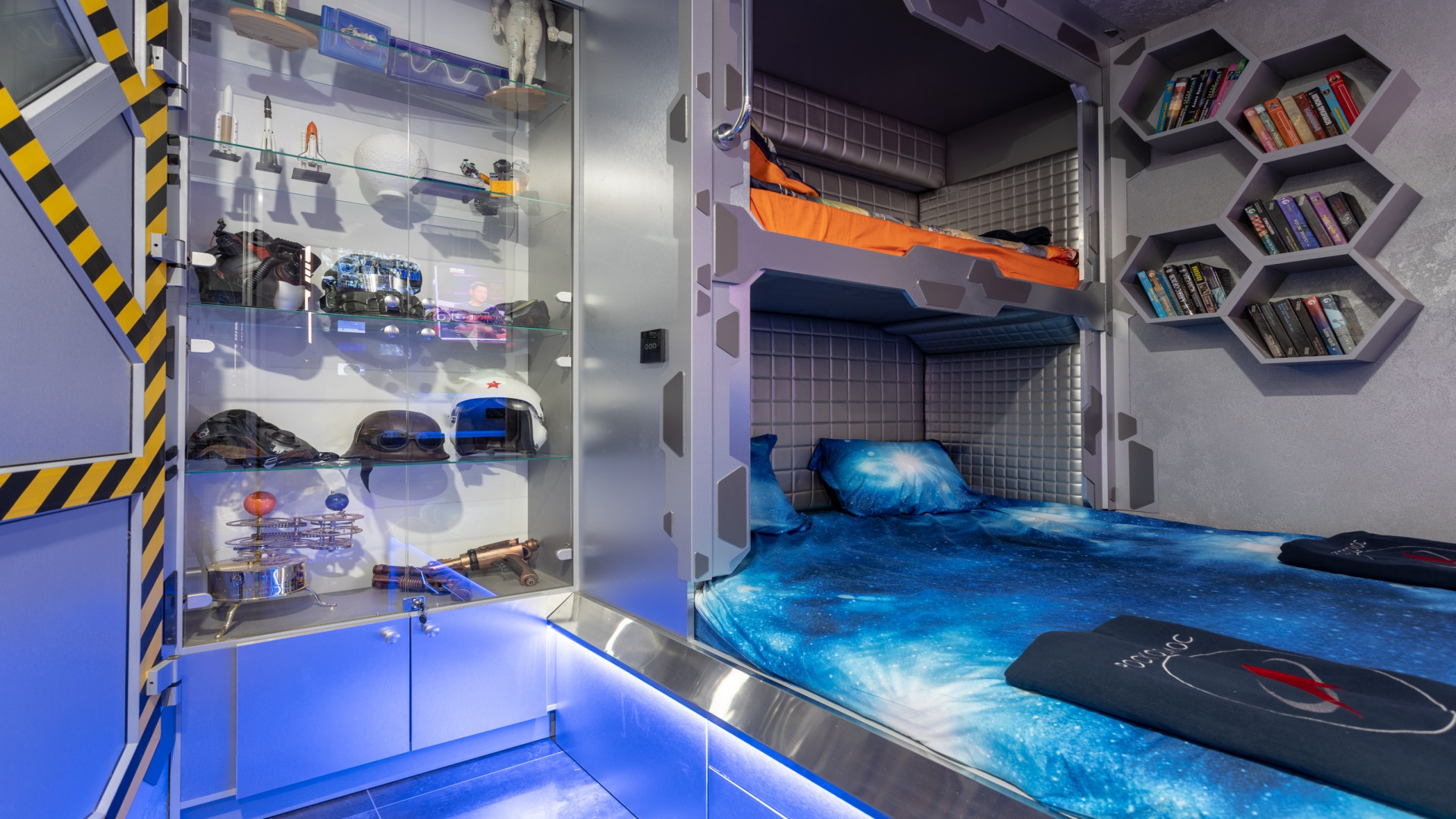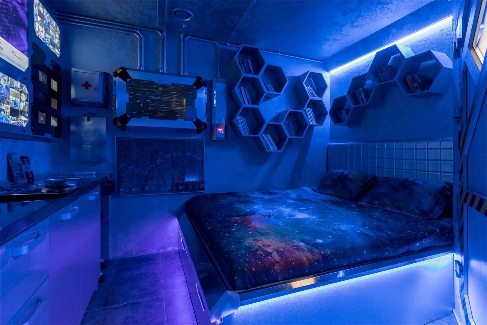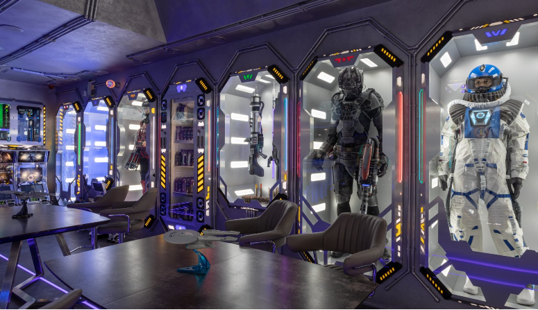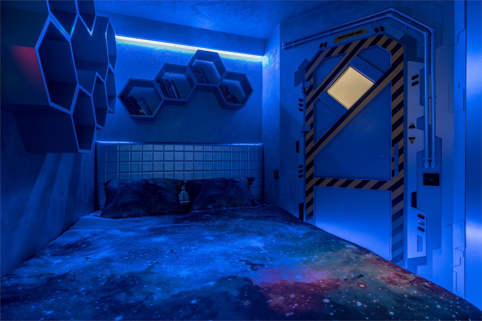 Космические каюты в гостинице "Страж Империи". Комплекс выполнен в виде фантастического космического корабля и включает в себя: 12 кают членов экипажа, готовых к проживанию. Ресепшн, рубка управления, кухня, кают-компания (столовая), сад Установлены три 3D симулятора, рубка управления. 3D симулятор от первого лица, платформа с подвесом. По всему кораблю находятся музейные экспонаты из фантастических фильмов, истории космонавтики, метеориты, образцы современной техники -проекторы, 3D телевизоры, гобопроекторы, интерактивные столы, компьютеры и т.д. В комплексе использовано 350 телевизоров и 120 планшетов. На комплексе воссоздана обстановка космического корабля во всех деталях любого космического блокбастера. Идут постоянные сообщения, потоки видео, в иллюминаторах космос, планеты и полет, и т.д. Обстановка приближена к настоящей. Назначение комплекса: - проведение экскурсий по кораблю на 40 минут - проживание в каютах реального космического корабля, погружение в полную космическую обстановку. Комфортабельные и уютные каюты для полноценного погружения в атмосферу космических приключений. На Ваш выбор двух- и трёхместные каюты, в каждой из которых собственная душевая и туалет, удобные кровати, стол, интерактивные мониторы и небольшая библиотека отечественной и зарубежной фантастики. Окна в каютах отсутствуют. Этим Вы более глубокого погрузитесь в атмосферу заведения.