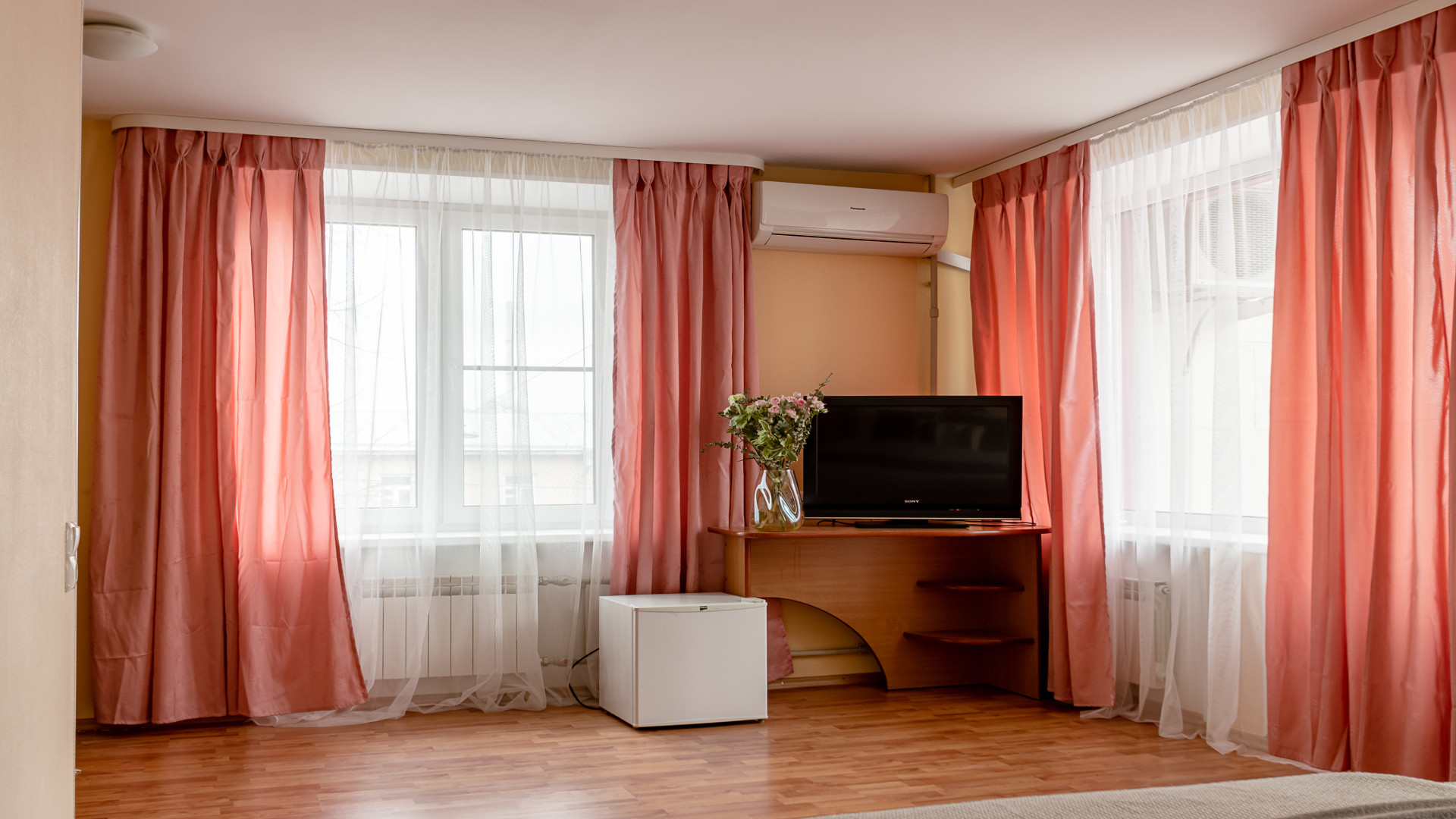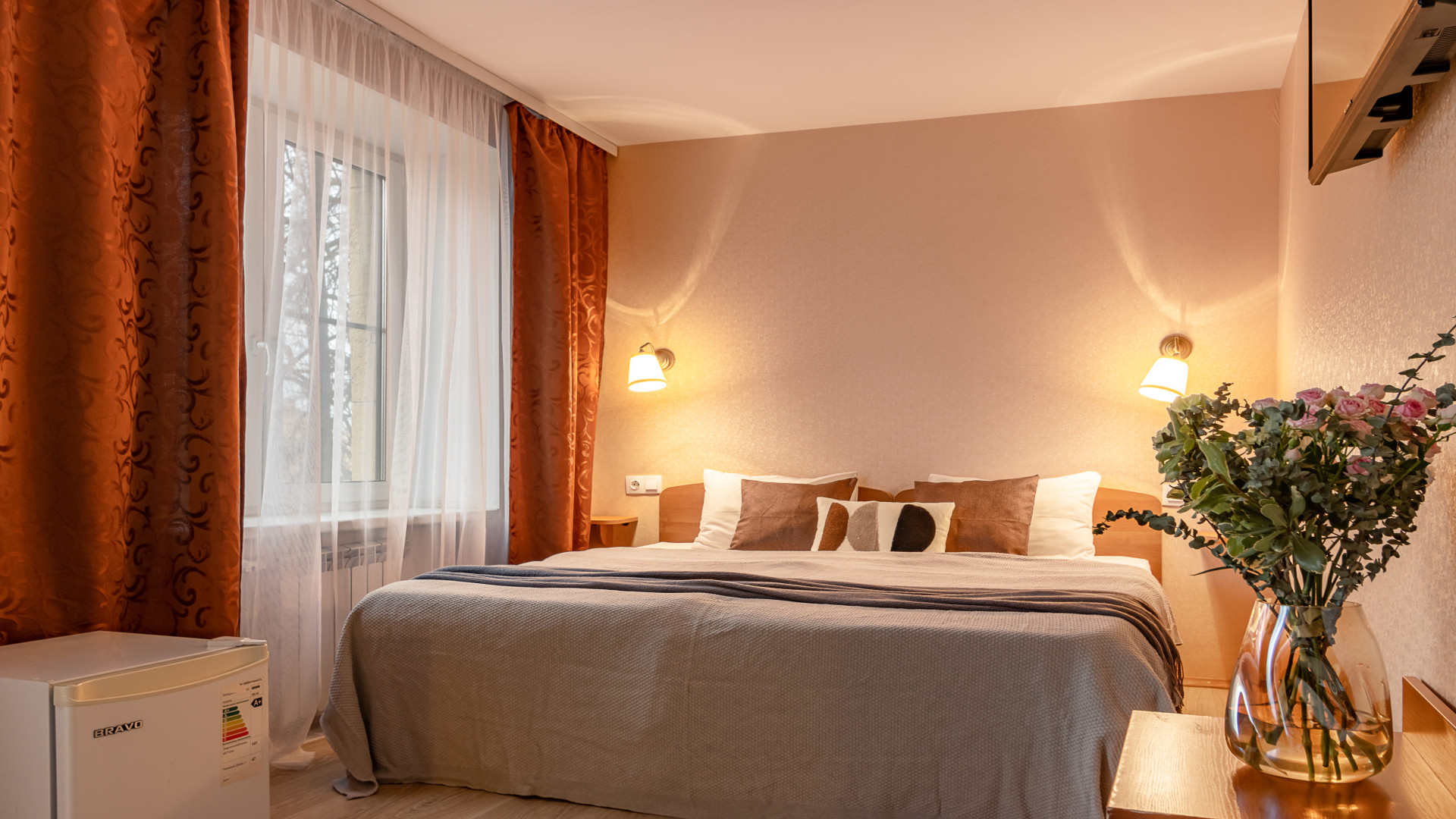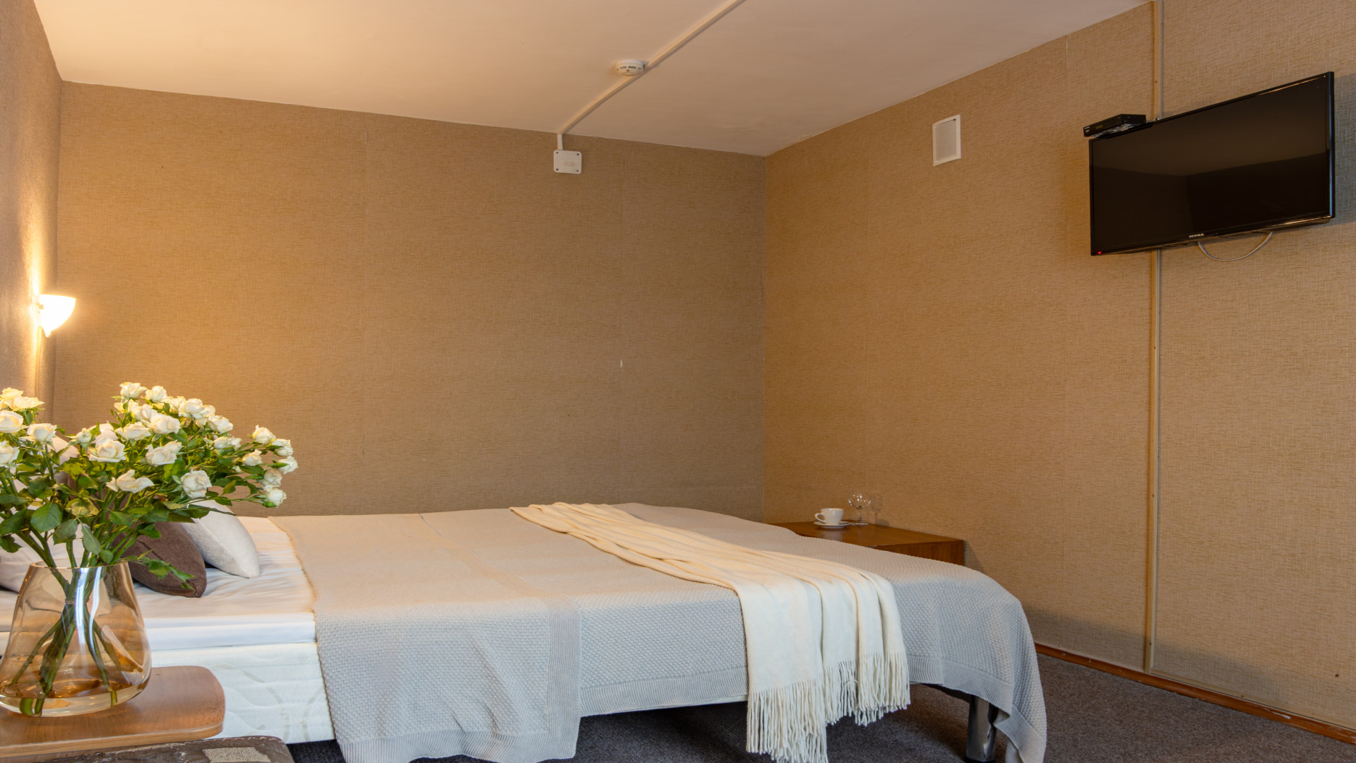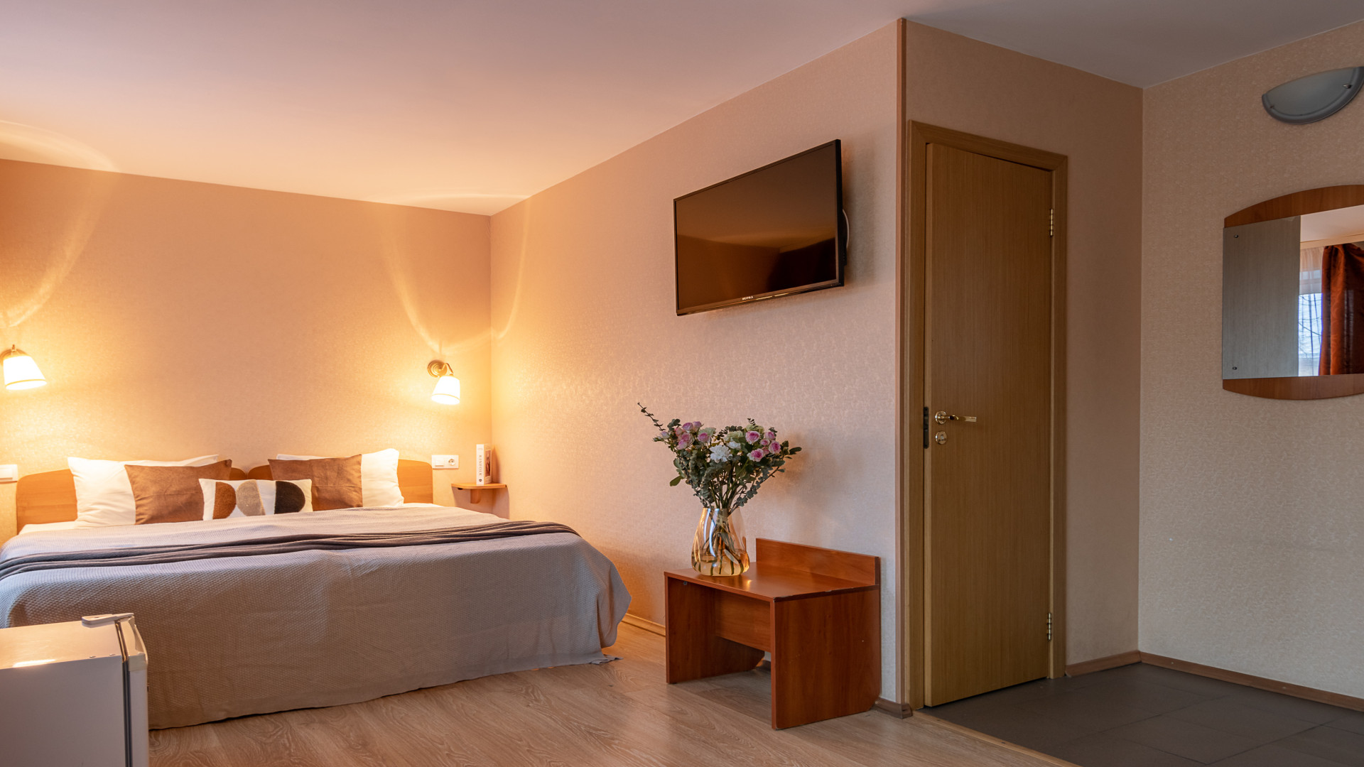 - В номере: душ, туалет, ТВ, холодильник, фен, телефон, электрочайник, двуспальная кровать