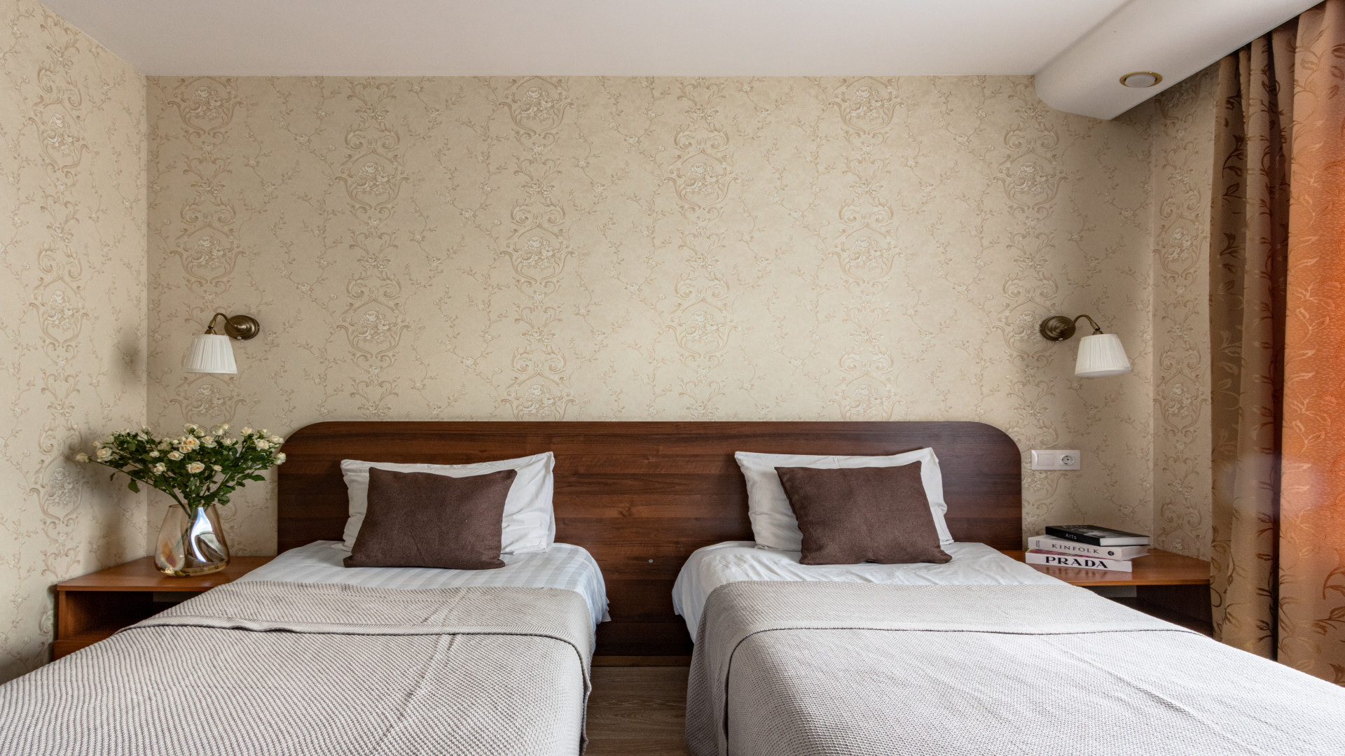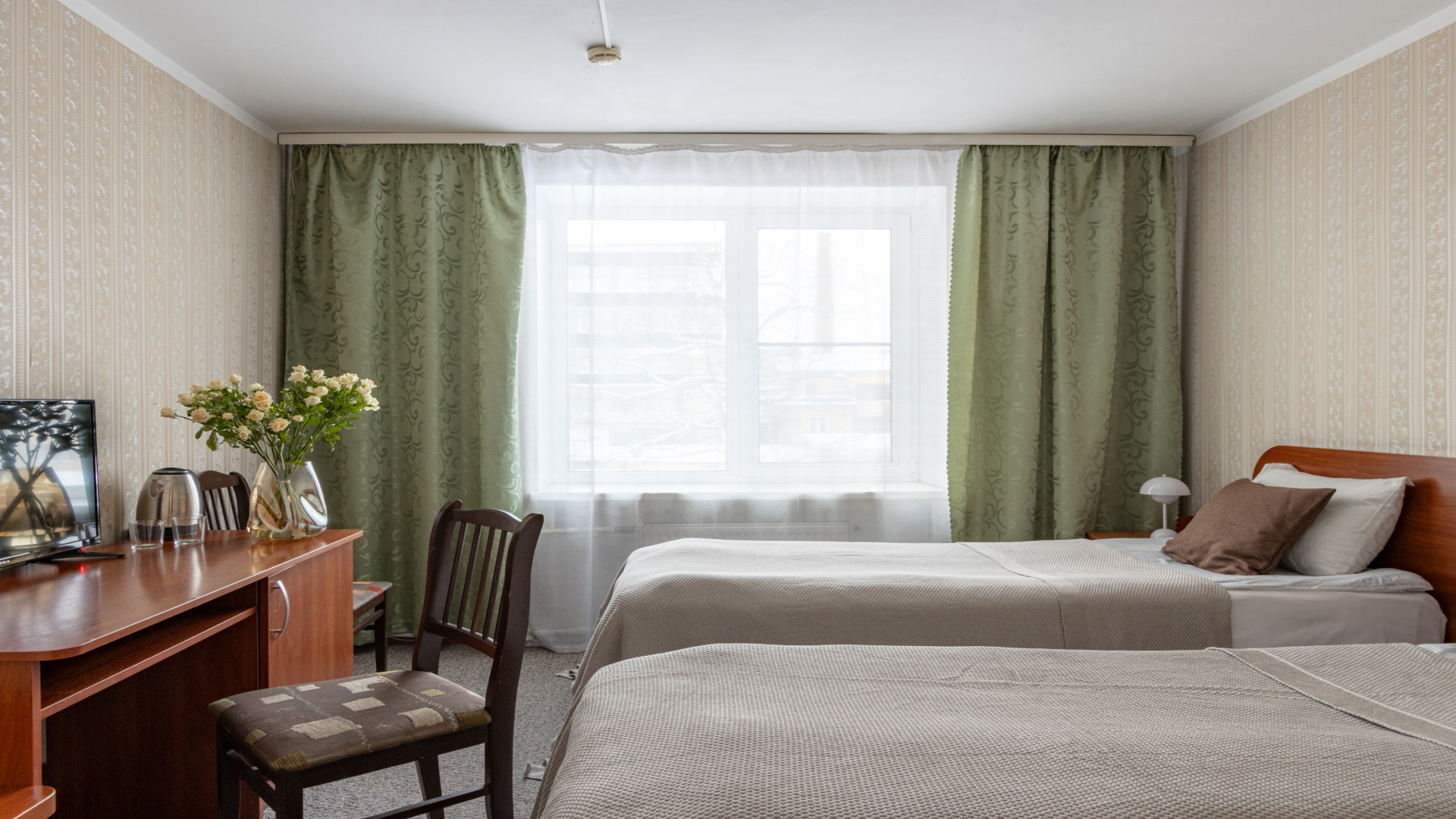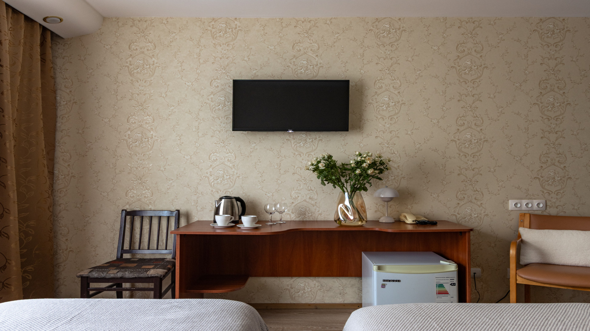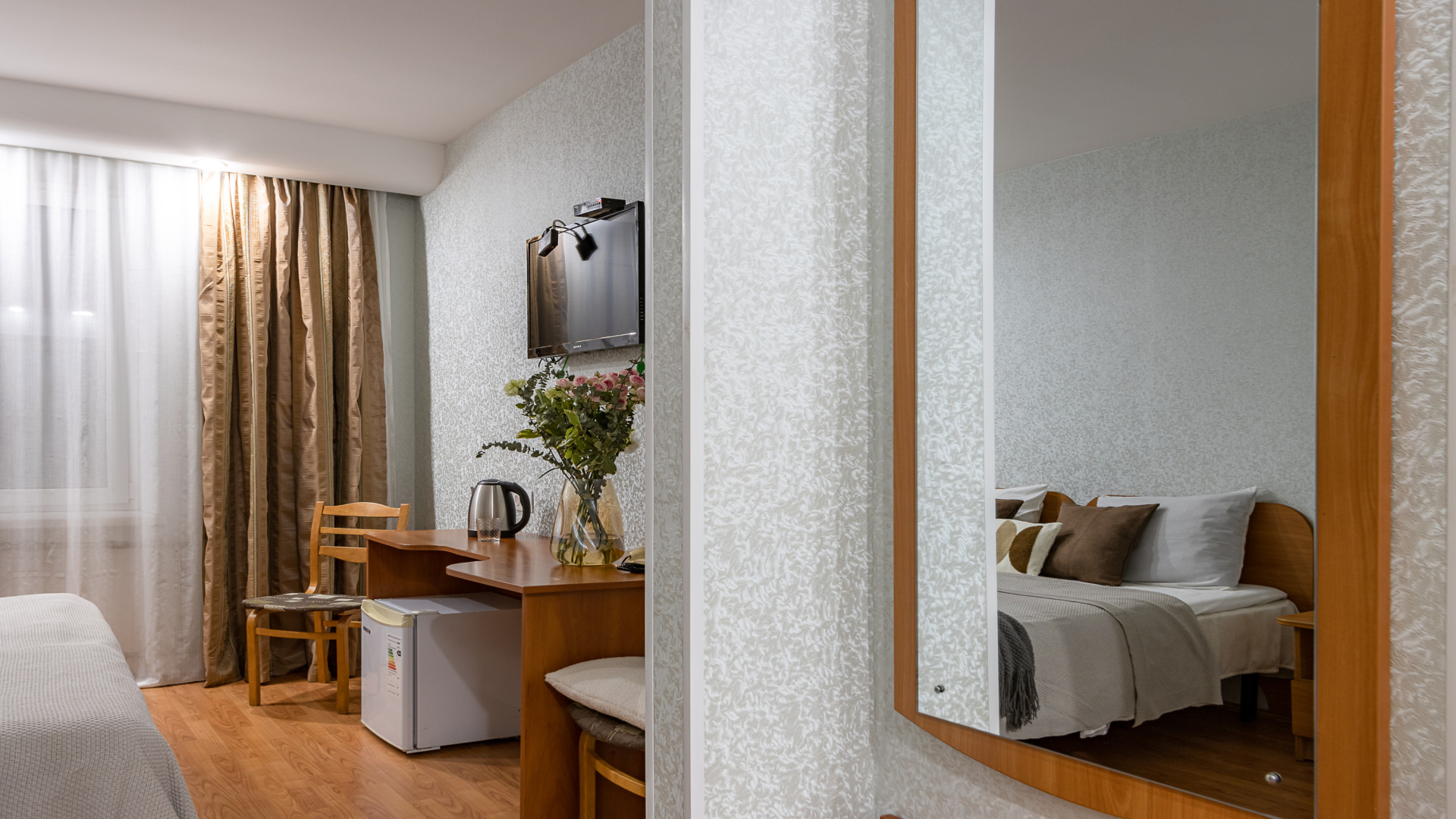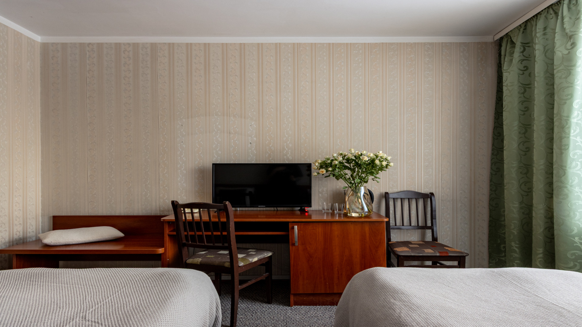 - В номере: душ, туалет, ТВ, холодильник, фен, телефон, электрочайник, две раздельные кровати