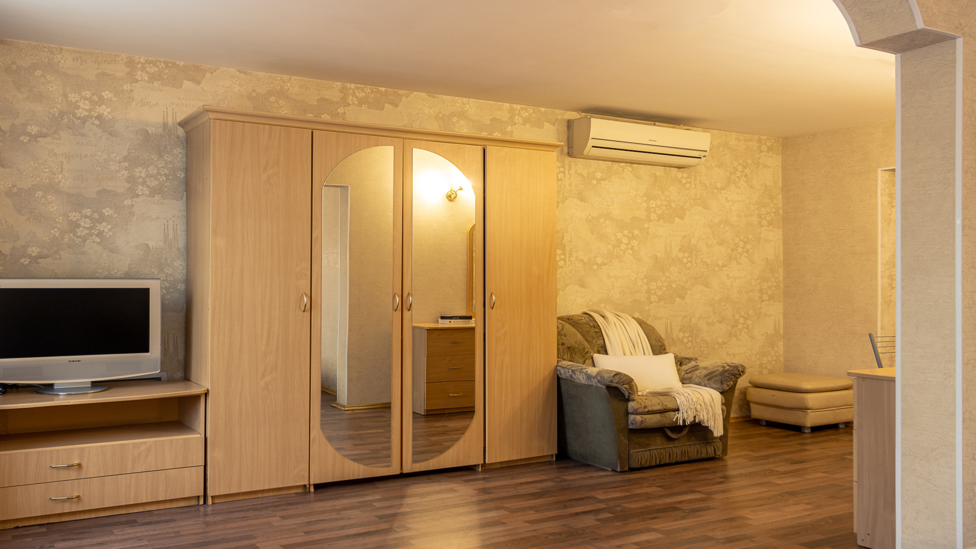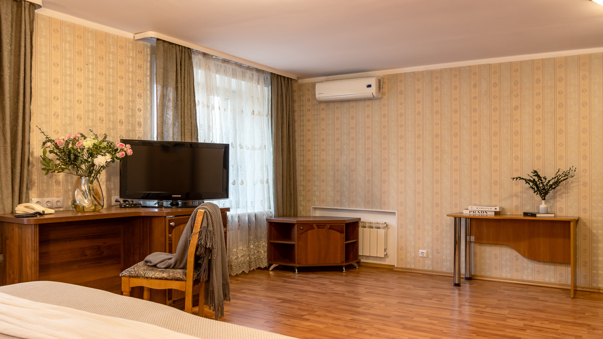 - В номере: душ, туалет, ТВ, холодильник, кондиционер, фен, телефон, мини-кухня, чайная станция, электрочайник, СВЧ-печь, двуспальная кровать