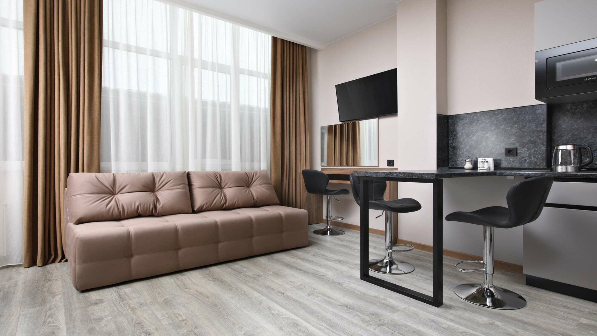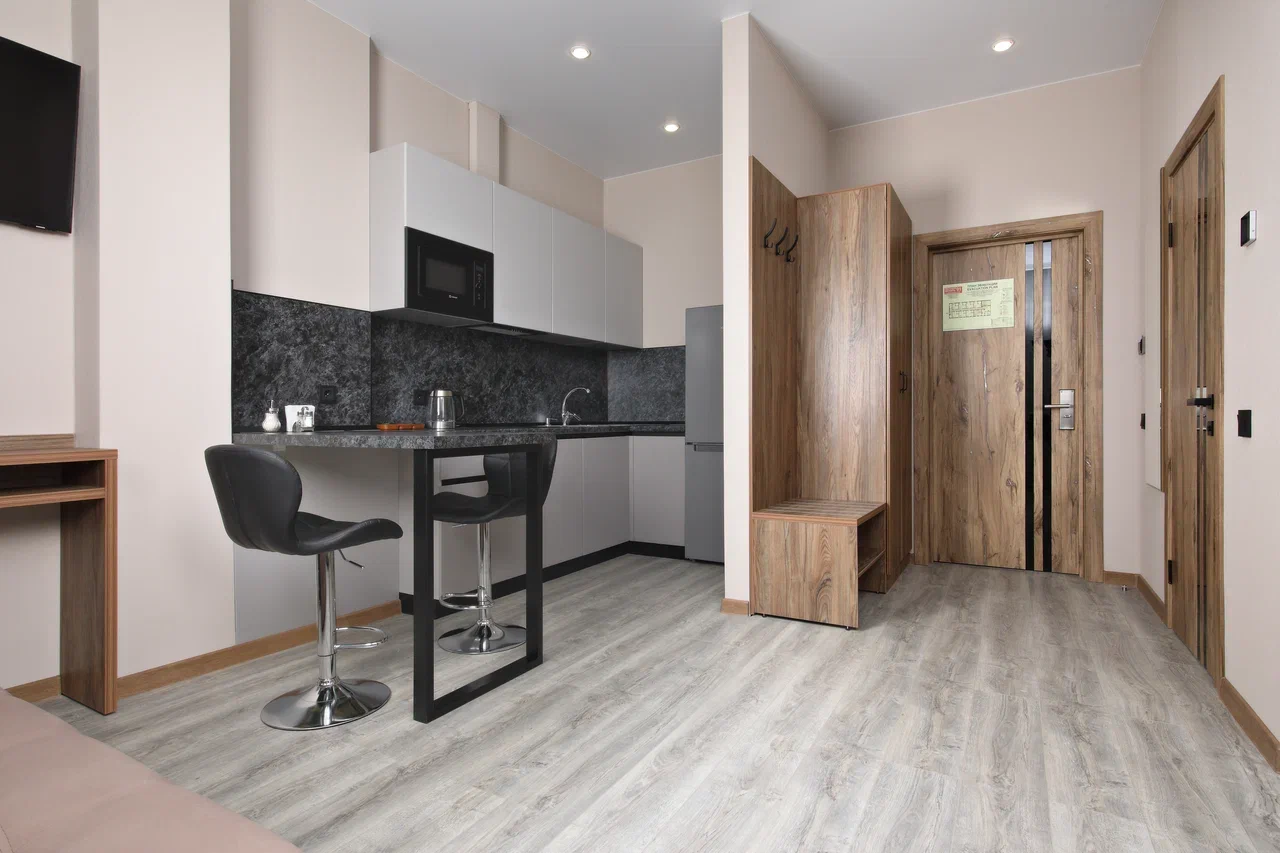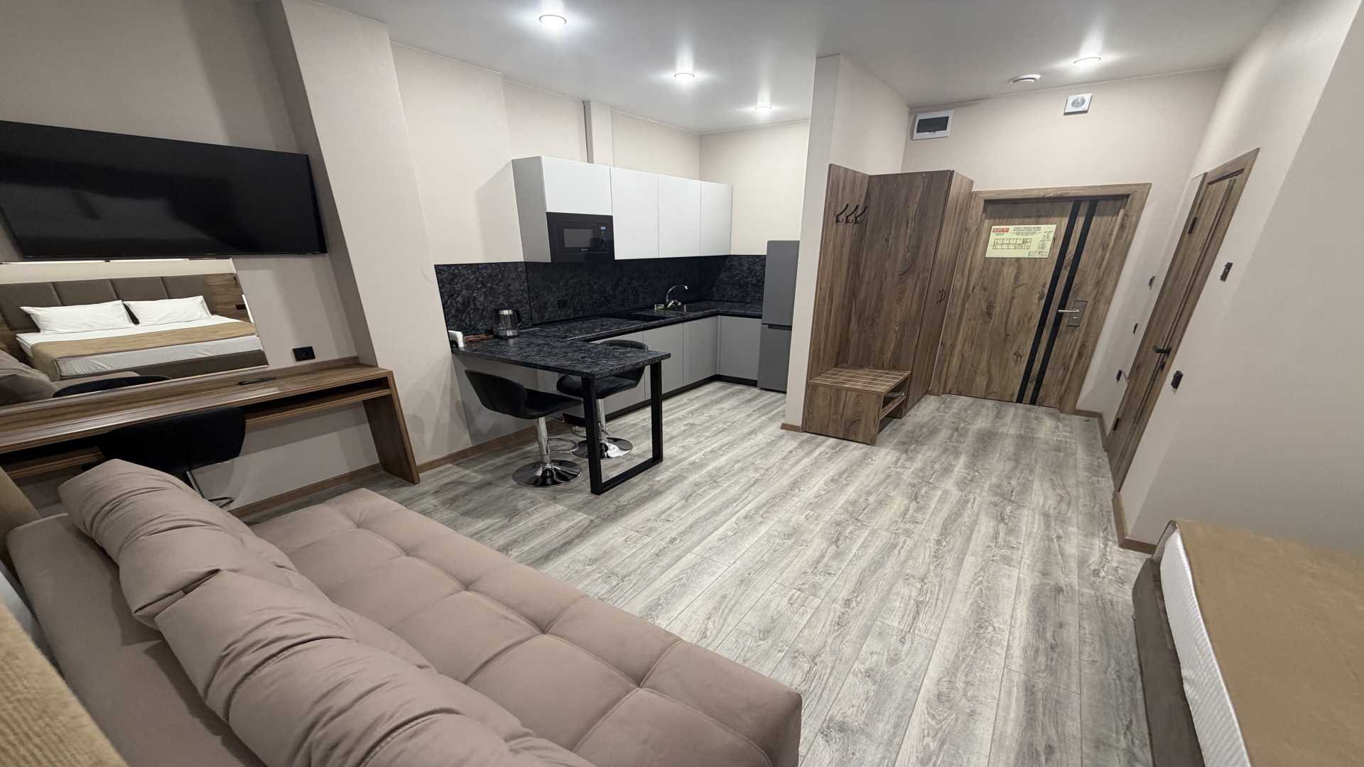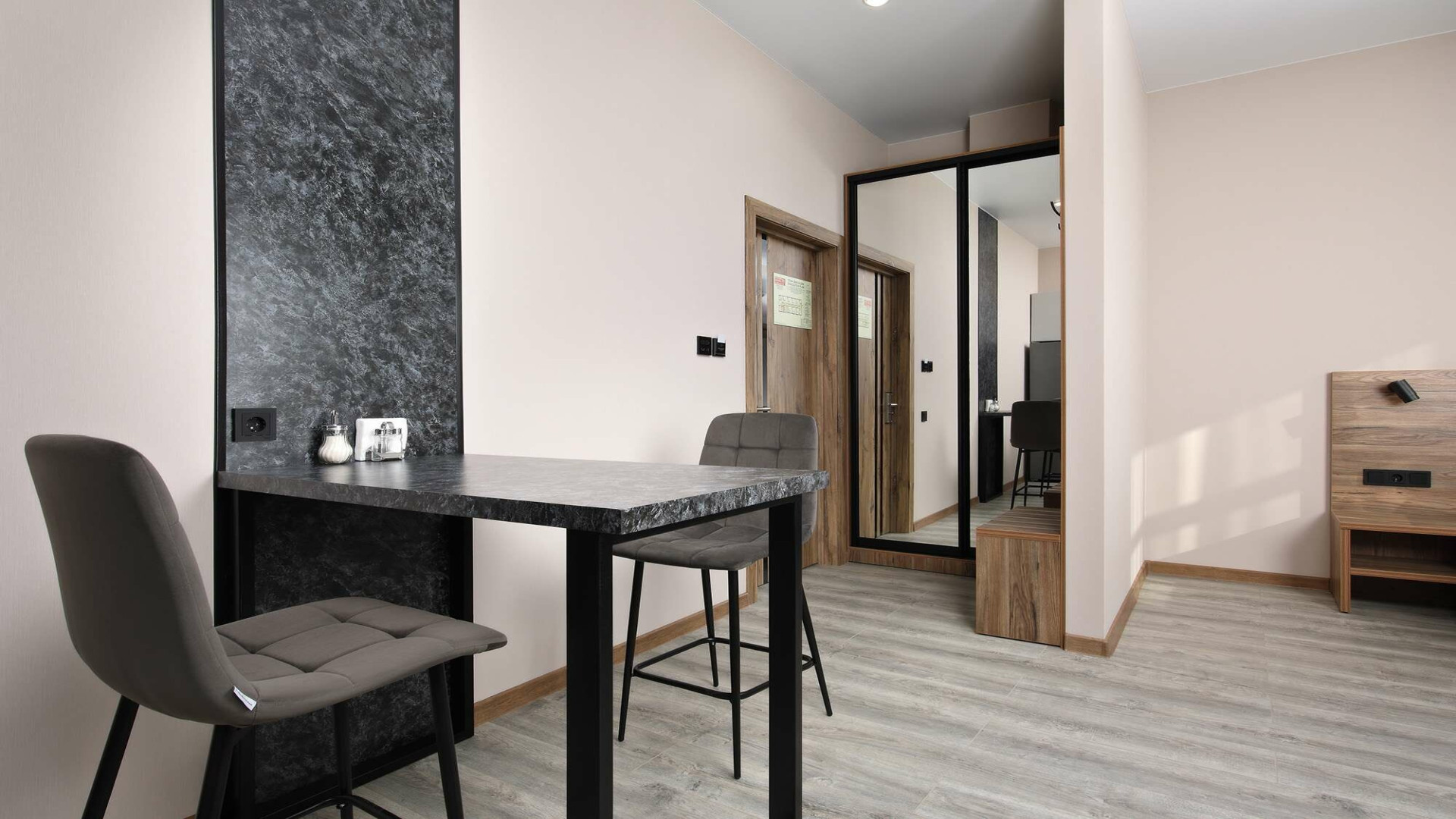 Для проживания гостям предлагаются номера, оборудованные всем необходимым для комфортного проживания. В номере: комфортабельные спальные места, кондиционер, телевизор, рабочее место, кухня с обеденной зоной, оборудованная всей необходимой техникой и посудой, сейф, санузел с душем и стиральной машиной.